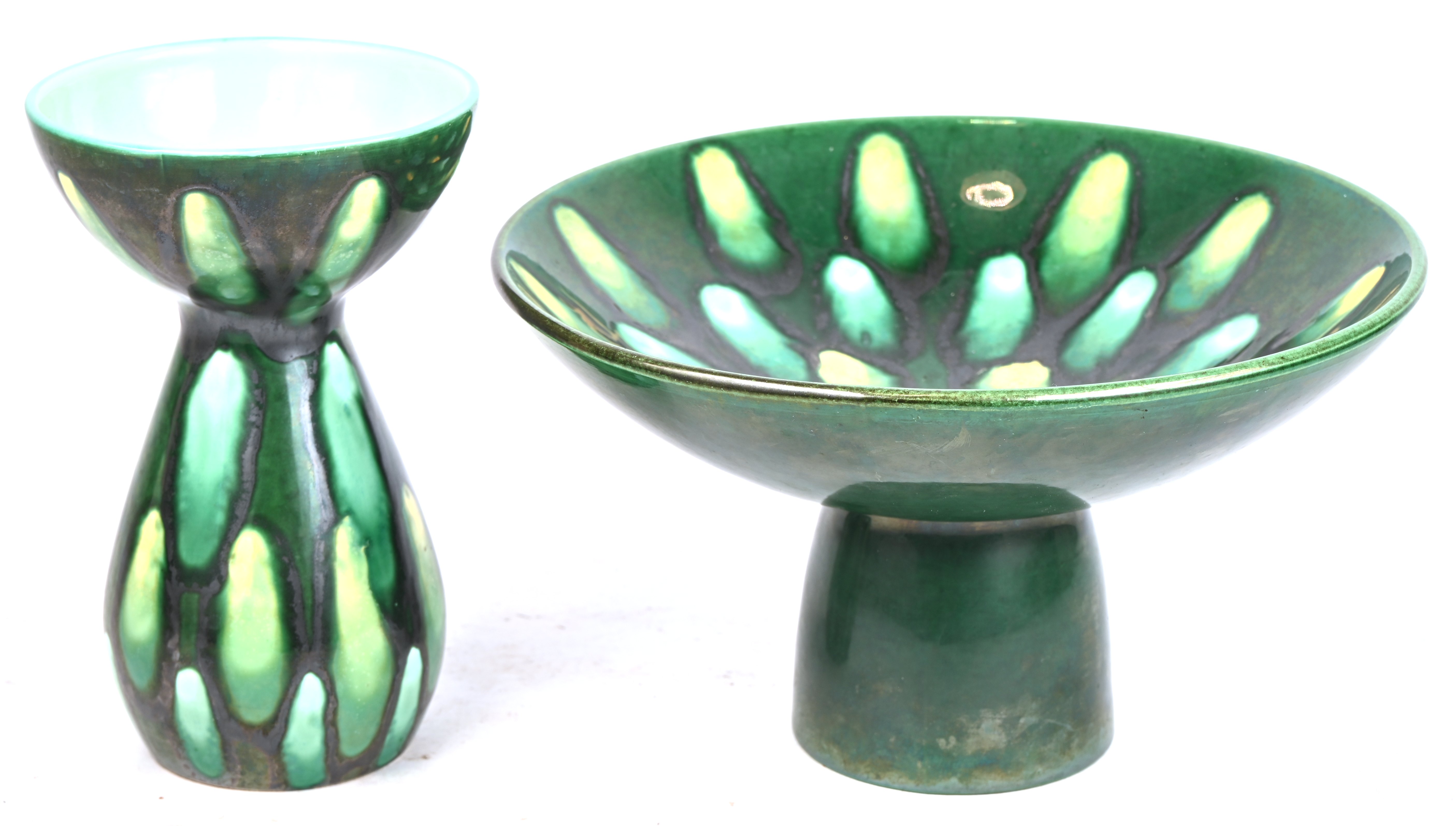 Een vaas en een schaal op voet van geel/groen geglazuurd aardewerk. Onderaan gemerkt.