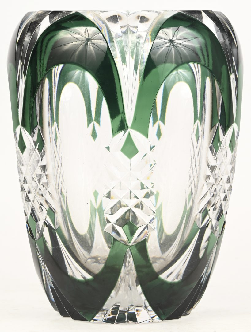Een kristallen vaas, groen in de massa gekleurd, gemerkt.