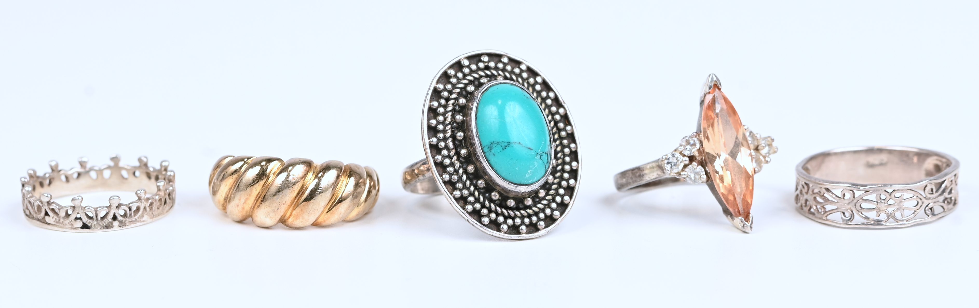 One of five silver rings, some set with imitation stones.