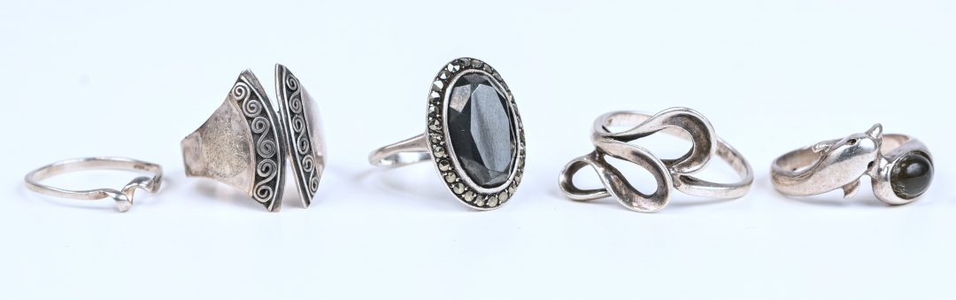 Een van vijf zilveren ringen sommige bezet met fantasiestenen.