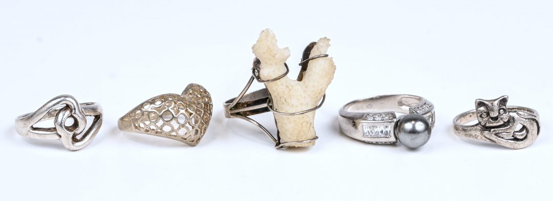 Een van vijf zilveren ringen sommige bezet met fantasiestenen.