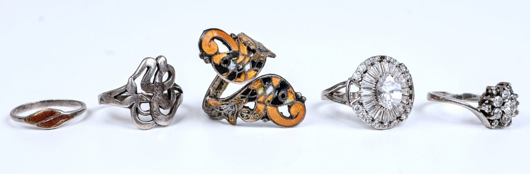 Een van vijf zilveren ringen sommige bezet met fantasiestenen.