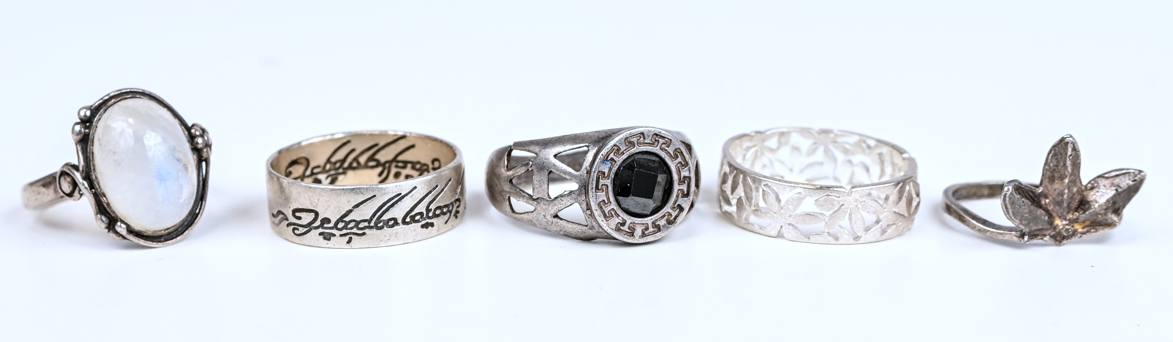 One of five silver rings, some set with fantasy stones.