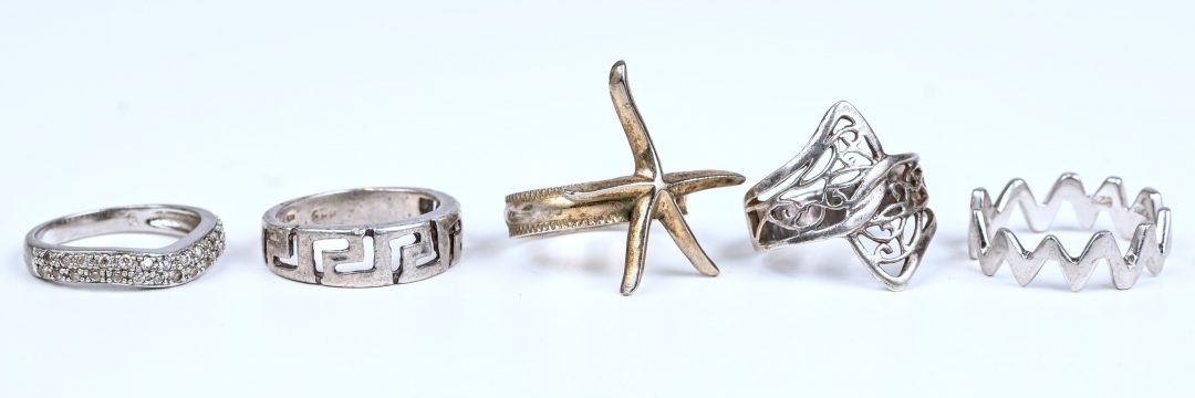 Een van vijf zilveren ringen sommige bezet met fantasiestenen.