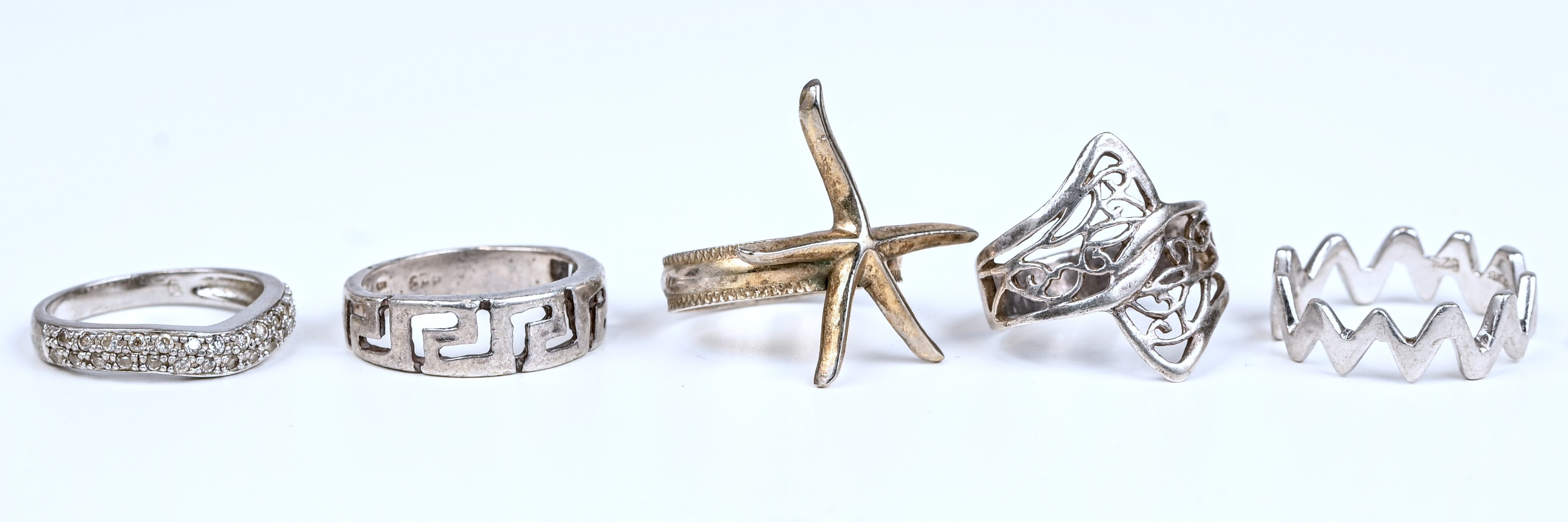 One of five silver rings, some set with imitation stones.