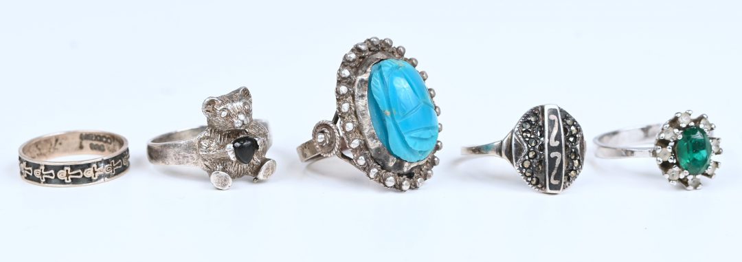Een van vijf zilveren ringen sommige bezet met fantasiestenen.