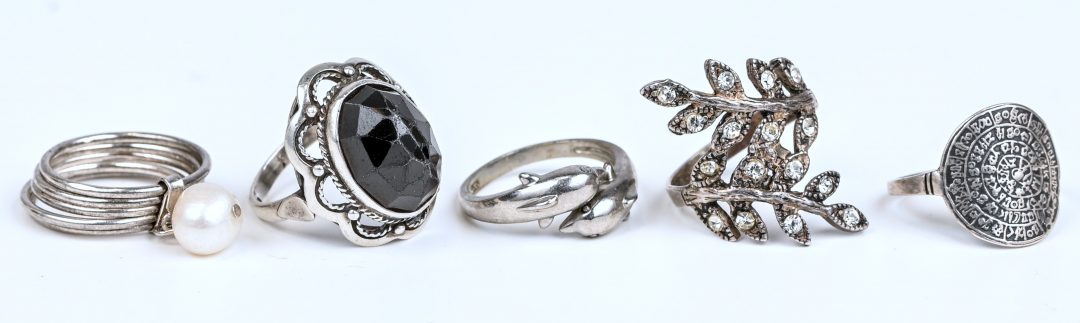 Een van vijf zilveren ringen sommige bezet met fantasiestenen.