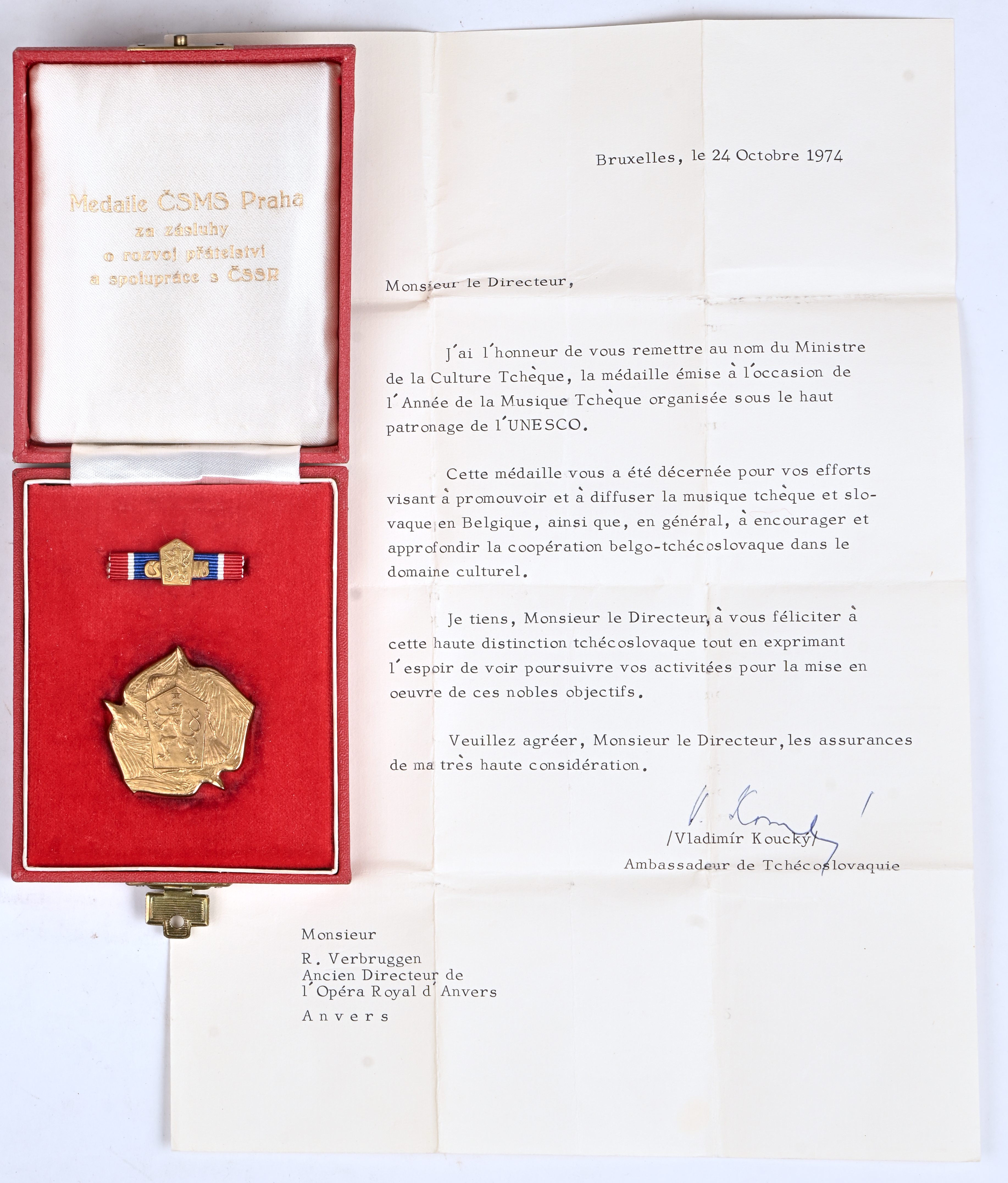 Een vergulde medaille van de CSMS-Praag voor verdiensten op het gebied van vriendschap en samenwerking met Tsjechoslowakije. Met bijhorend etui.