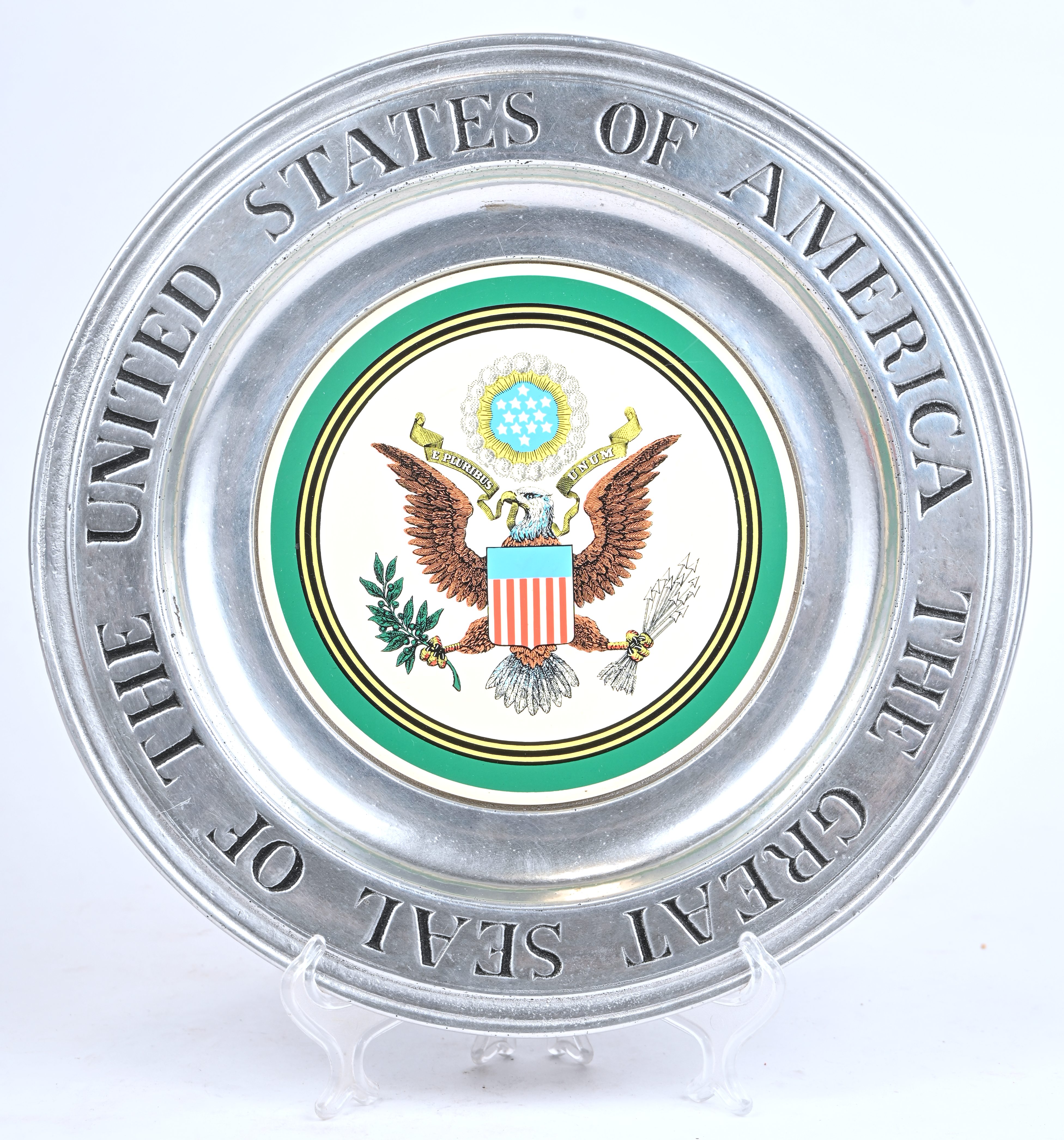 A collector’s plate depicting the Great Seal of the United States, armetale with a plastic center.