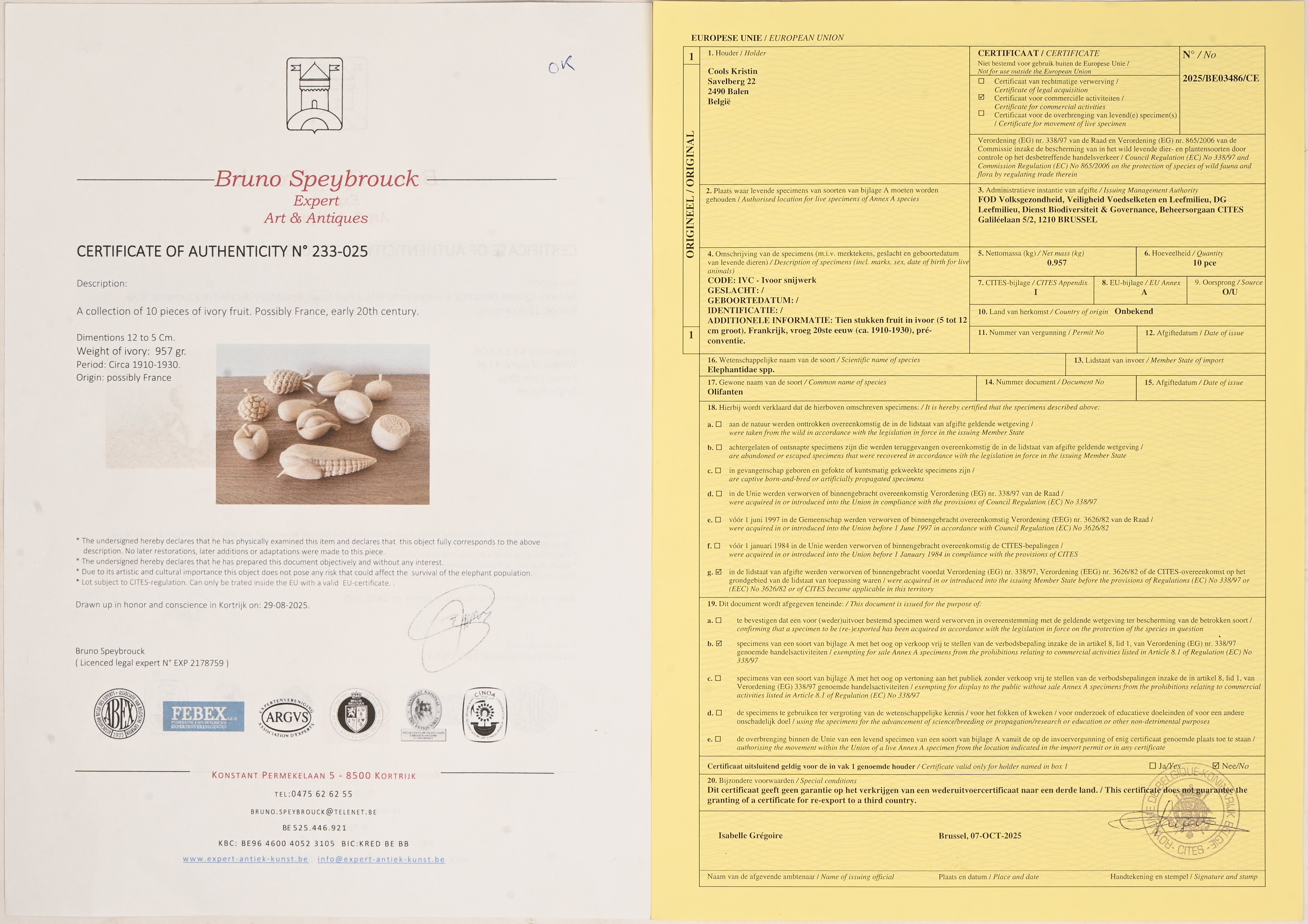 Een verzamelingen vruchten van gebeeldhouwd ivoor. 10 stuks. Met Citestattest.