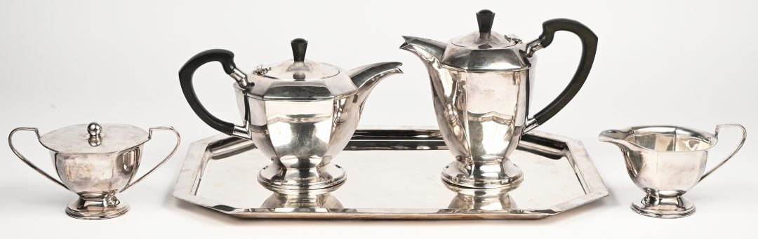 Een verzilverd koffie-en theestel met suikerpot en melkkannetje op dienblad. Gemerkt: Carmen.