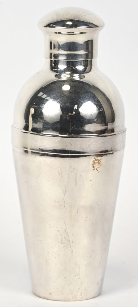 A silver-plated metal cocktail shaker. Marked at the bottom. AR7