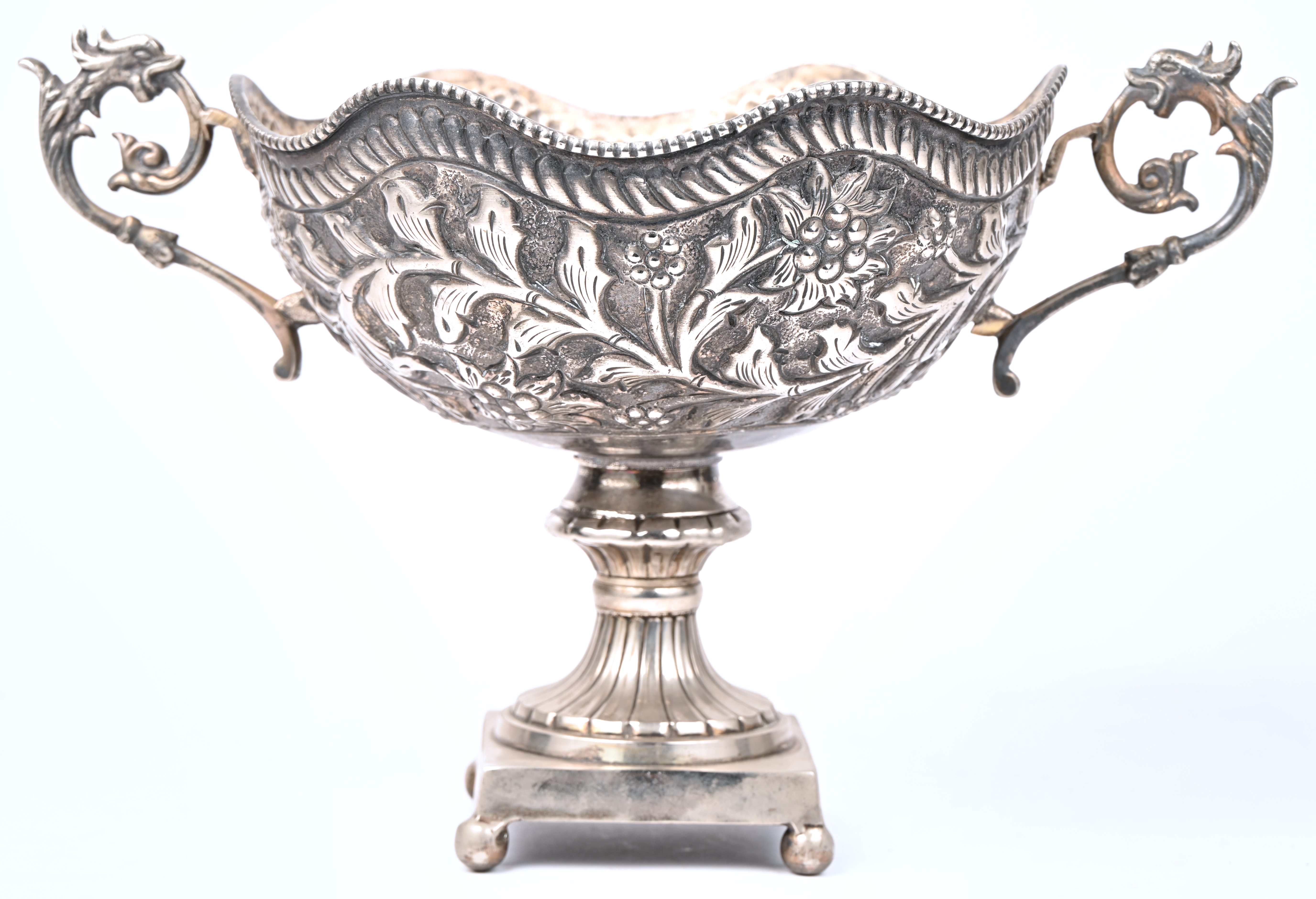 A silver-plated metal dish with floral decoration on a foot.