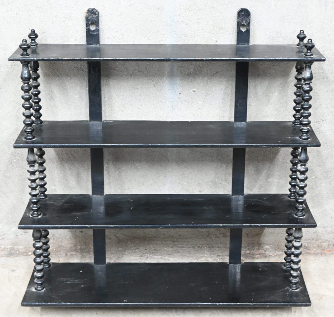 Een zwart geschilderd antiek massief eikenhouten wandrekje.