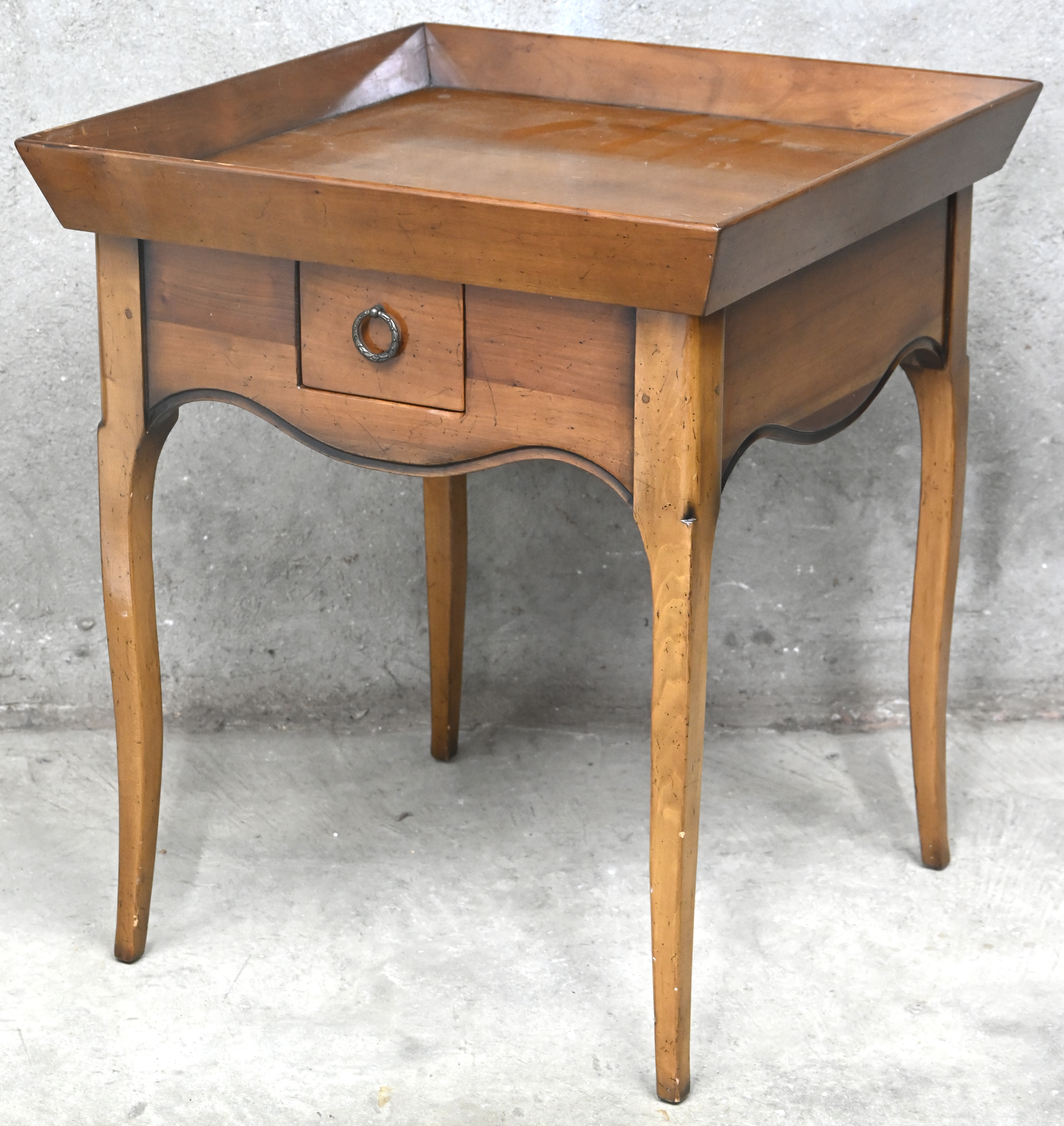 A square side table with a high rim and one drawer.