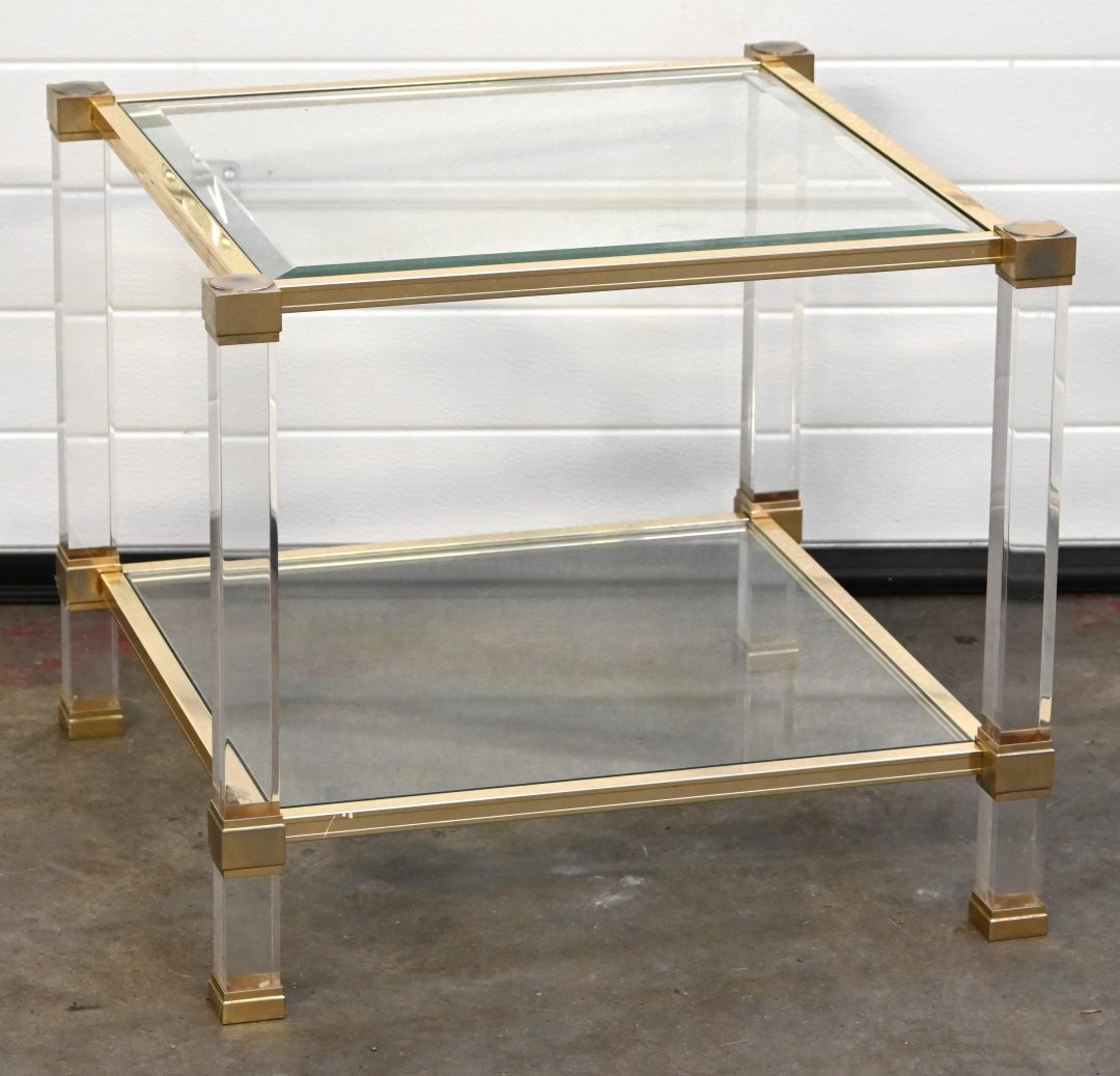 A rectangular vintage coffee table, brass, glass, and plexiglass, marked Pierre Vandel. The bottom glass shelf has slight damage to the corner.