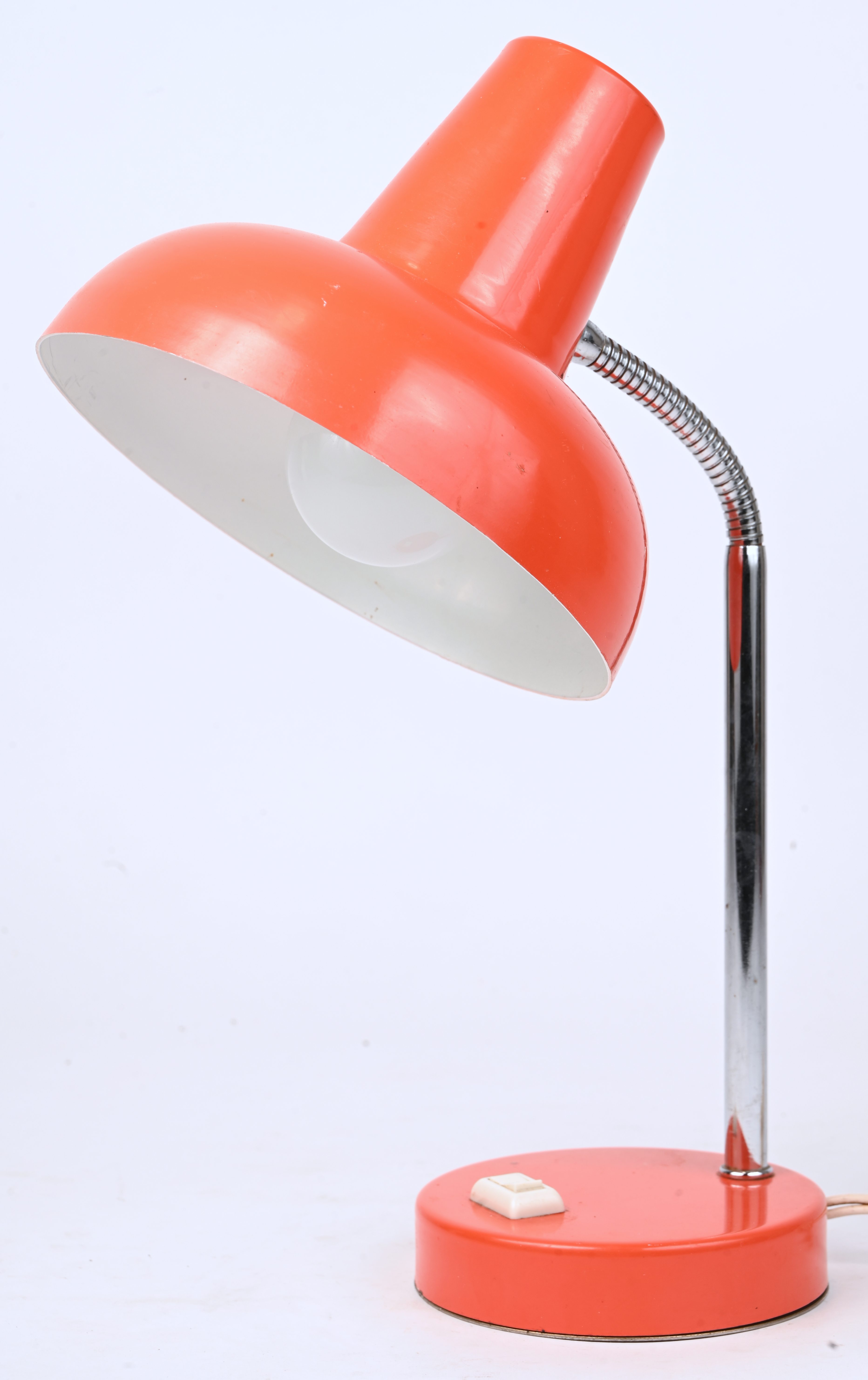 A vintage desk lamp, chromed metal and orange.