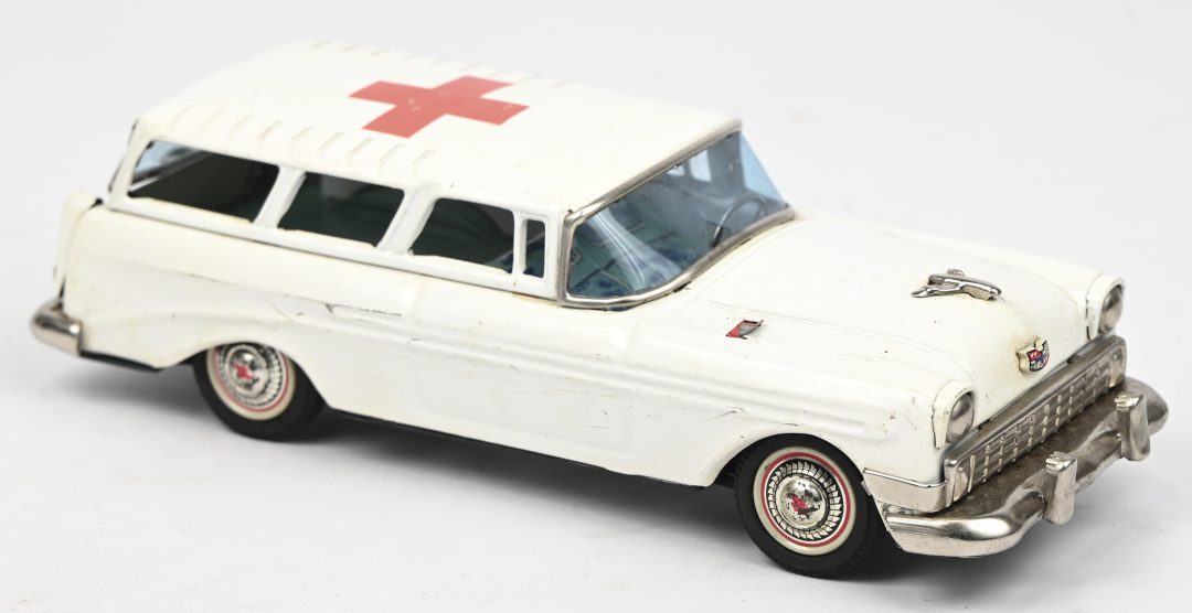 Een vintage Chrysler ambulance, made in Hong Kong. De schijnwerper is manco en er is schade aan de voorruit.