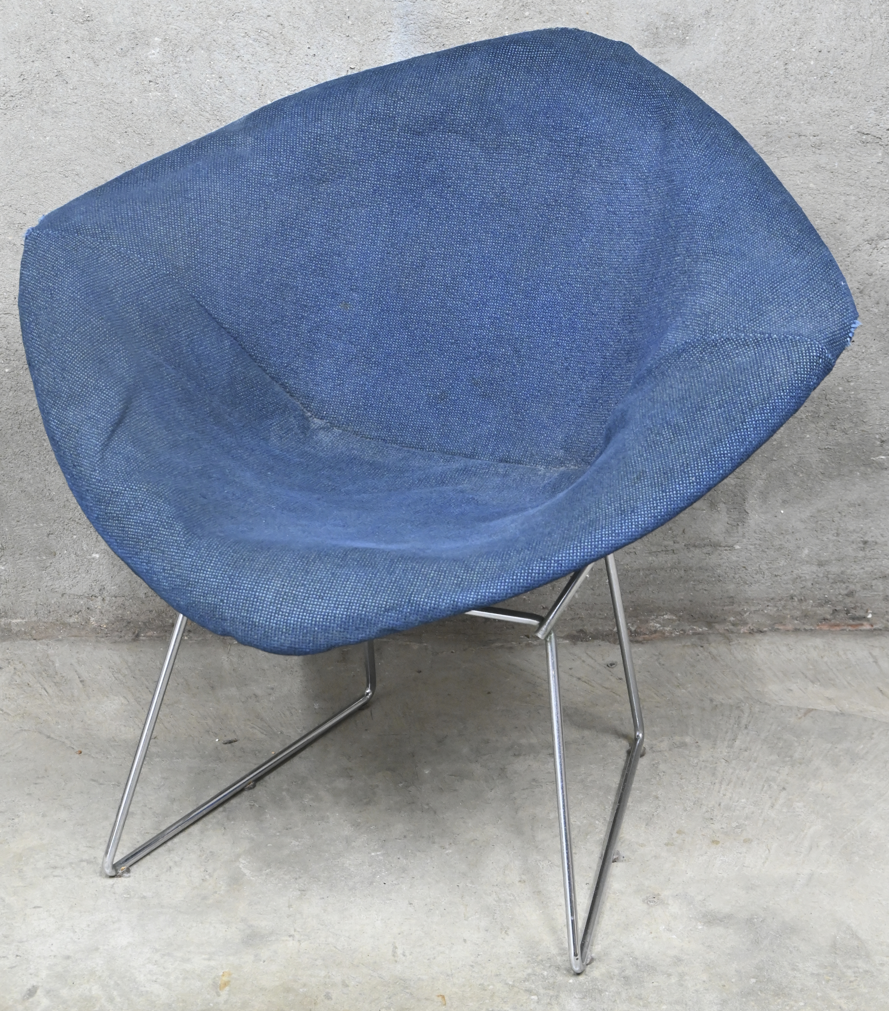 A vintage Diamond Chair designed by Harry Bertoia for Knoll. Unmarked. Blue hopsack full pad with worn foam.