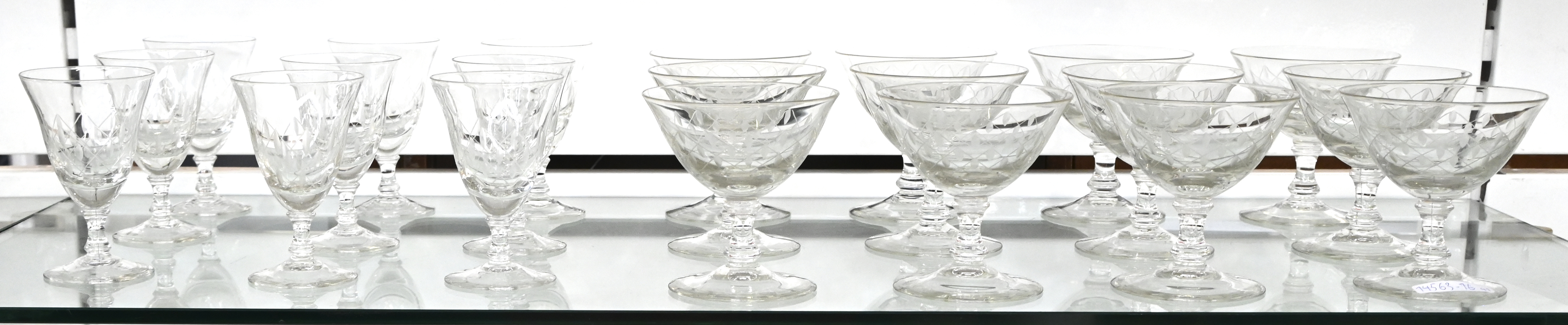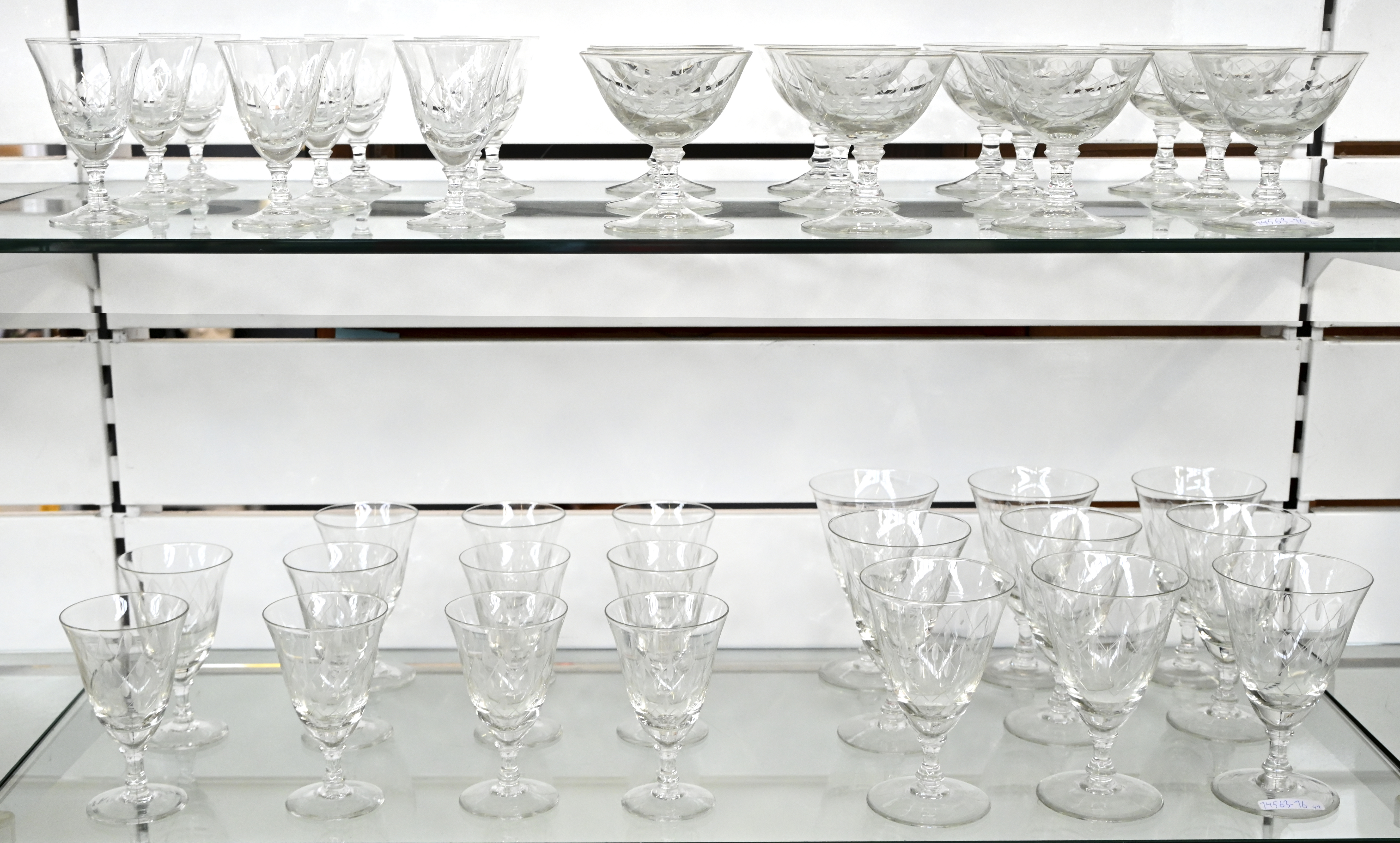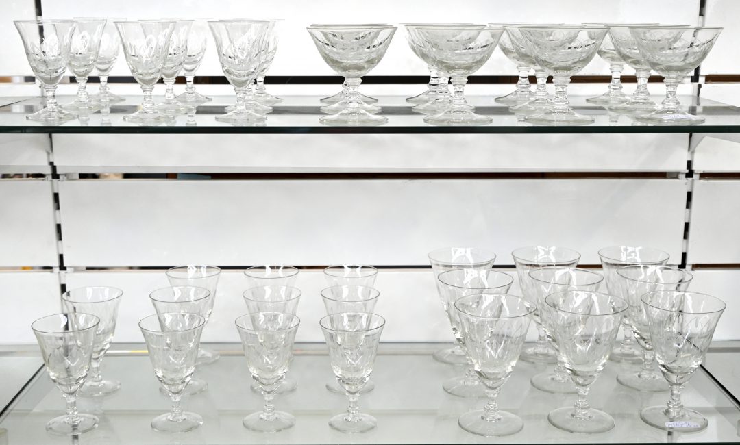 Een vintage geslepen glasservies bestaande uit 12 champagnecoupes, 9 waterglazen, 11 rode wijnglazen (1 met randschade) en 9 witte wijnglazen.