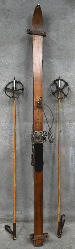 #147InselbergEen paar vintage ski’s gemerkt Inselberg, gedateerd ‘59. Met bijgevoegde bamboe stokken.