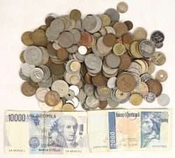 Lot of copper, bronze, and nickel coins and two bills from Portugal and Italy. From the end of the 19th century to the 1980s. Possibly Belgium, Bulgaria, Cuba, Germany, France, Great Britain, Italy, Yugoslavia, Luxembourg, Poland, Portugal, Rhodesia, Romania, United States, South Africa, Switzerland, and others. -