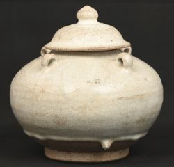 #357Een dekselpotje met 4 oren in de stijl van het steengoed met blauwgrijze glazuur gemaakt in Sawankhalok, Sukothai, Thailand in de 14e/15e eeuw.