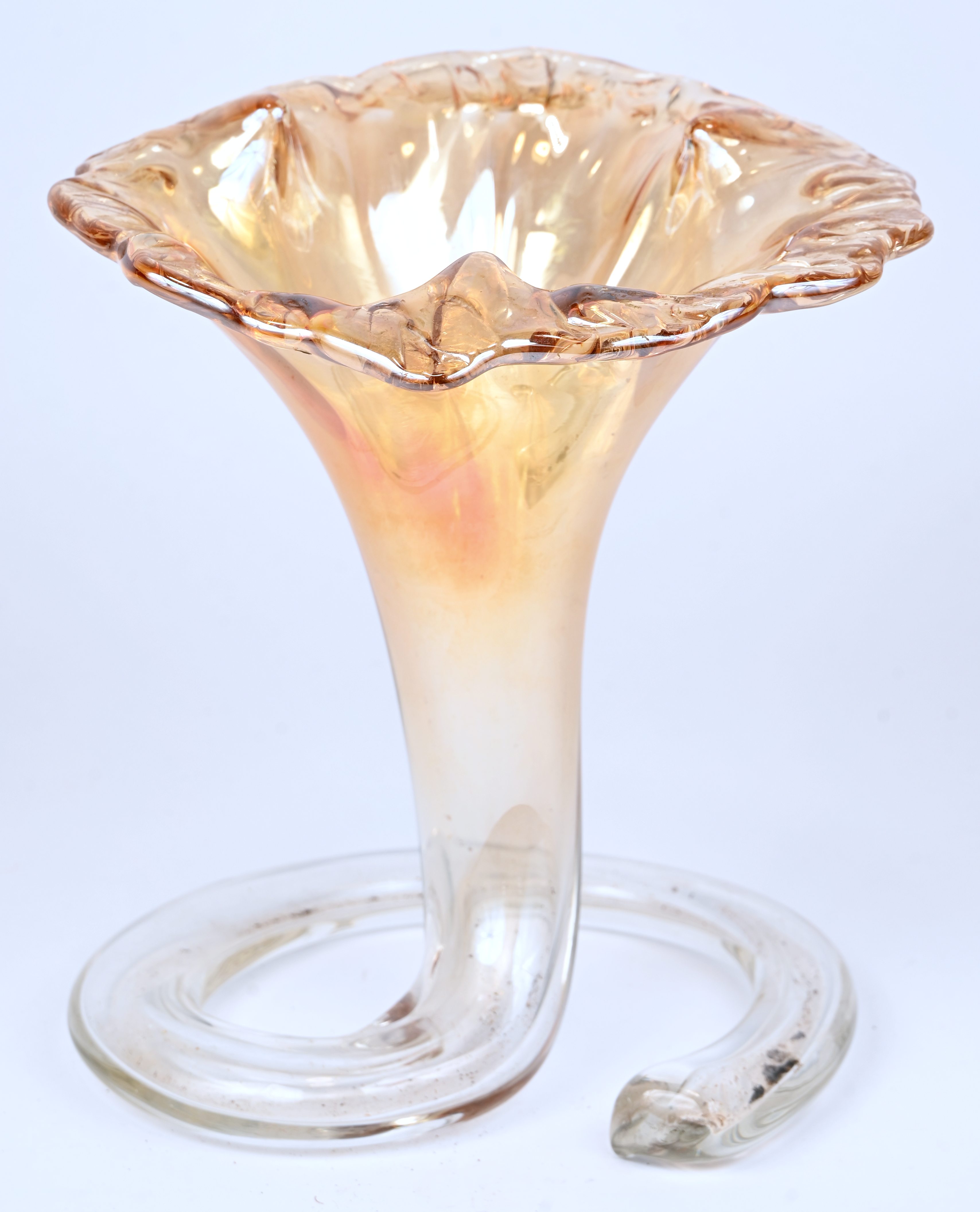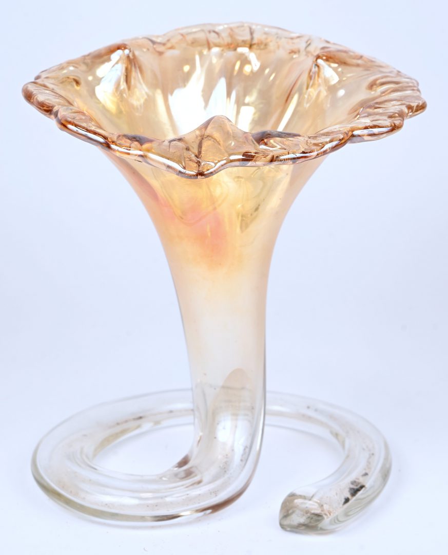 Een vintage glazen vaas, bloemvormige kelk, goudgeel-okerkleurig.