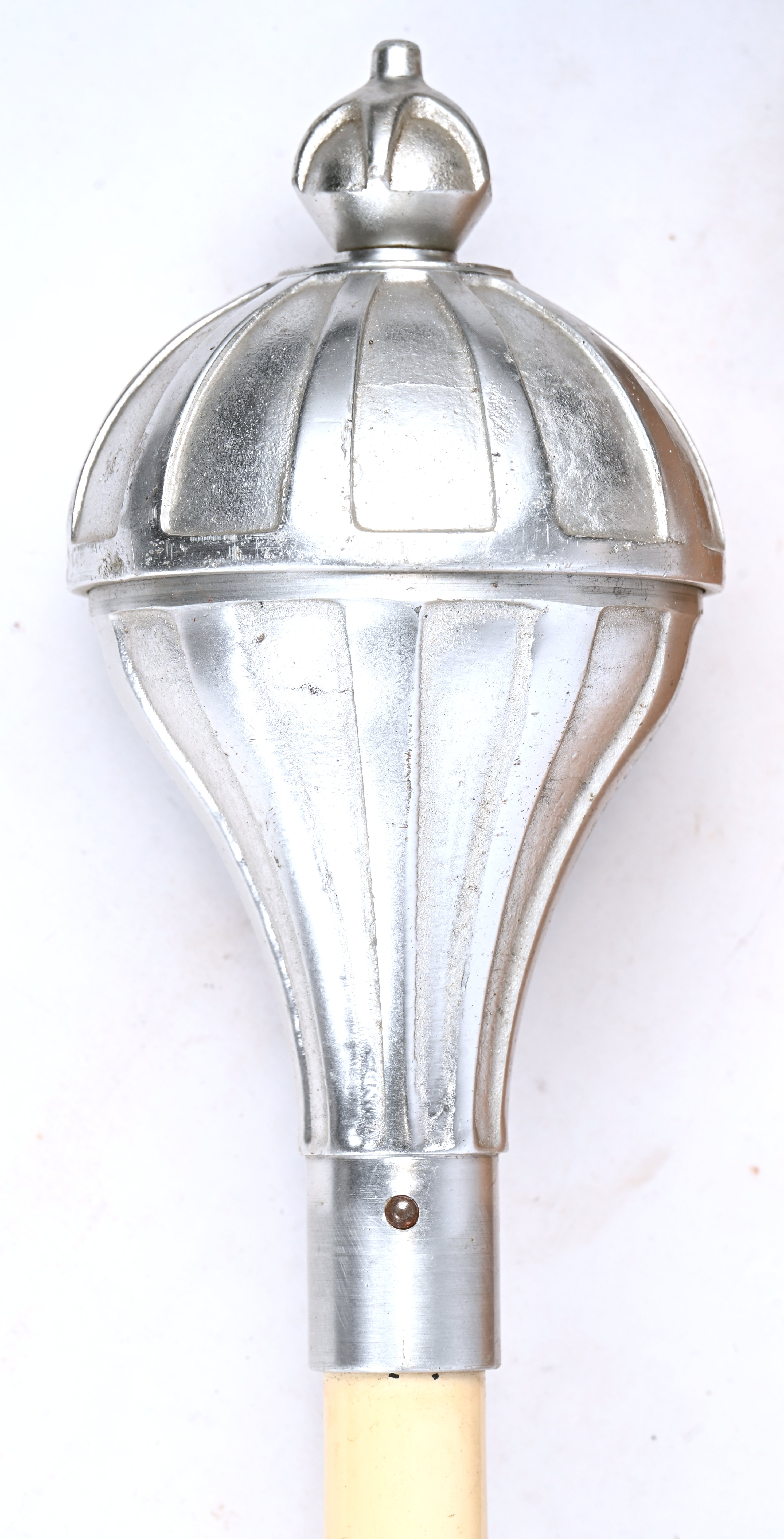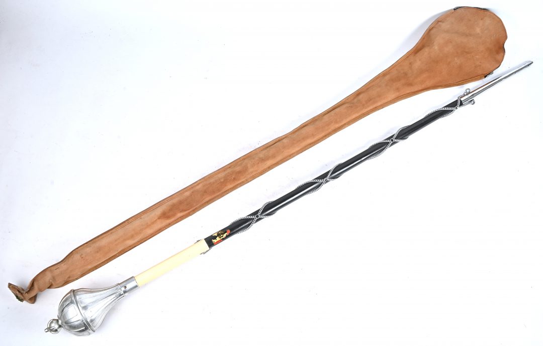 A vintage lacquered wooden music corps drum major mace/staff with silver-colored metal head and chain decoration. Marked Van der Glas, Heerenveen, in accompanying case.