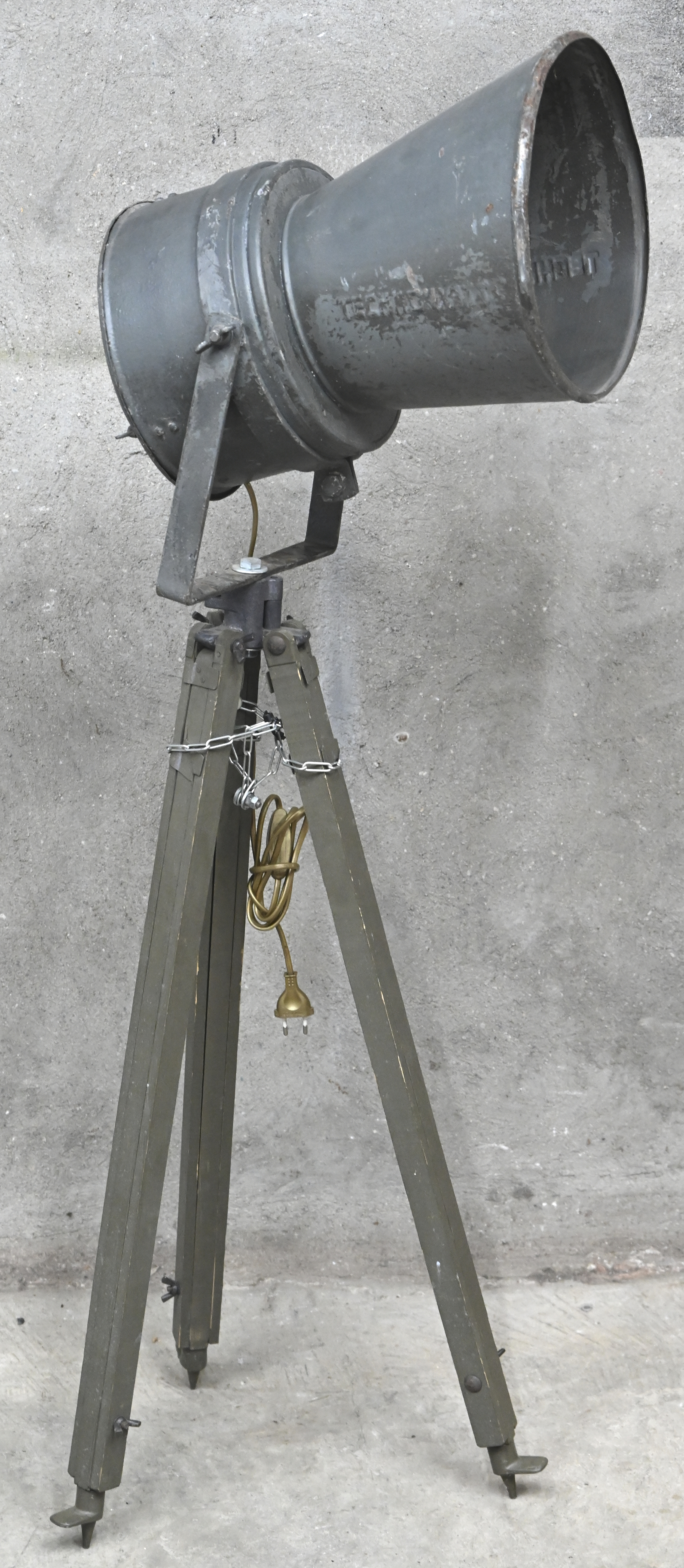 A vintage industrial lamp, marked Technowatt, mounted on an old adjustable tripod.