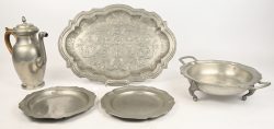 #68Vijf tinnen objecten bestaande uit een schotel, twee borden, een terrine op voetjes en een koffiepot met houten handvat. Met een gezamelijk brutogewicht van bijna 6 kg.