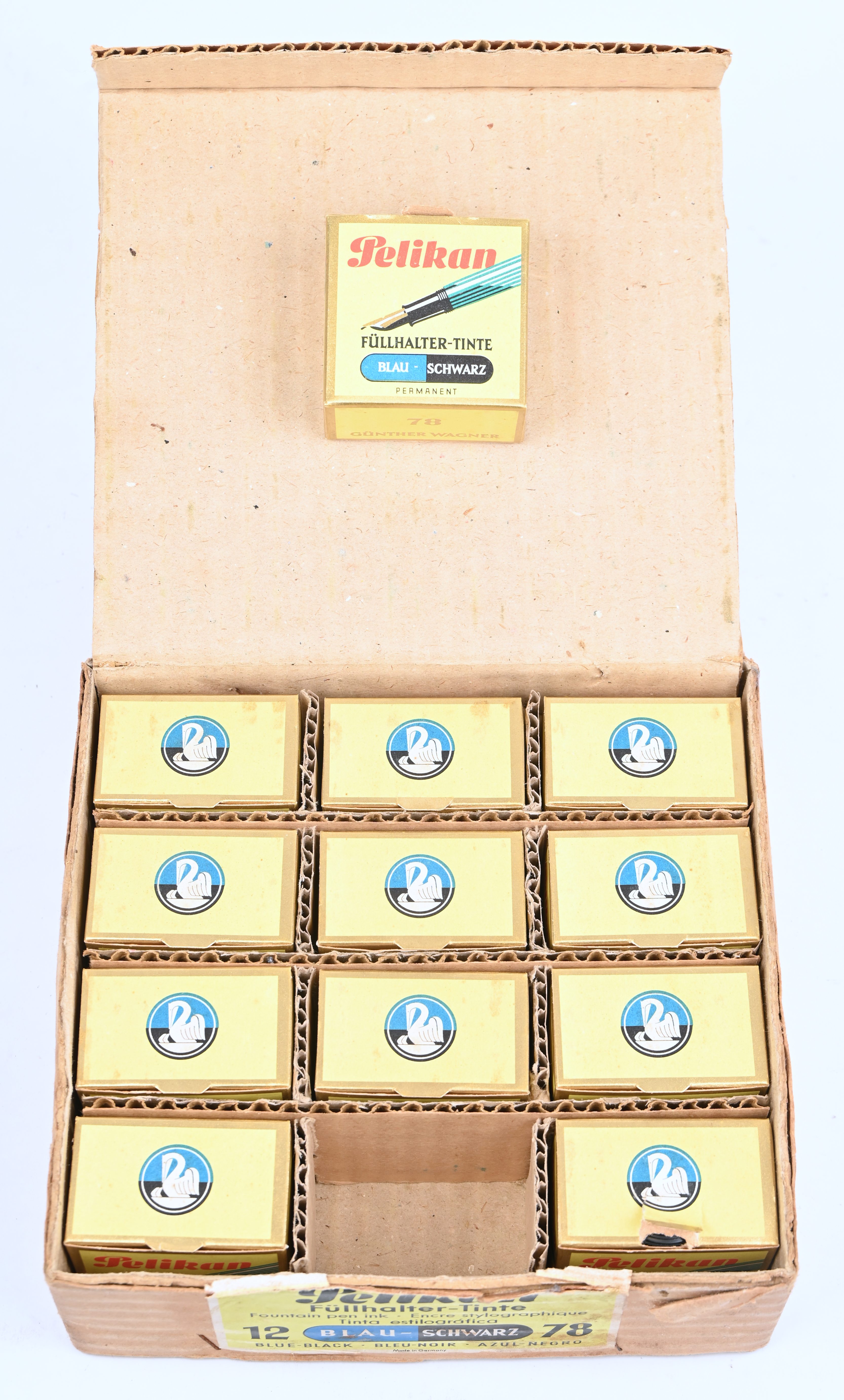 Een vintage lot van 11 volle inktpotten in originele verpakking, grote doos met 12 doosjes waarvan 1 lege.
