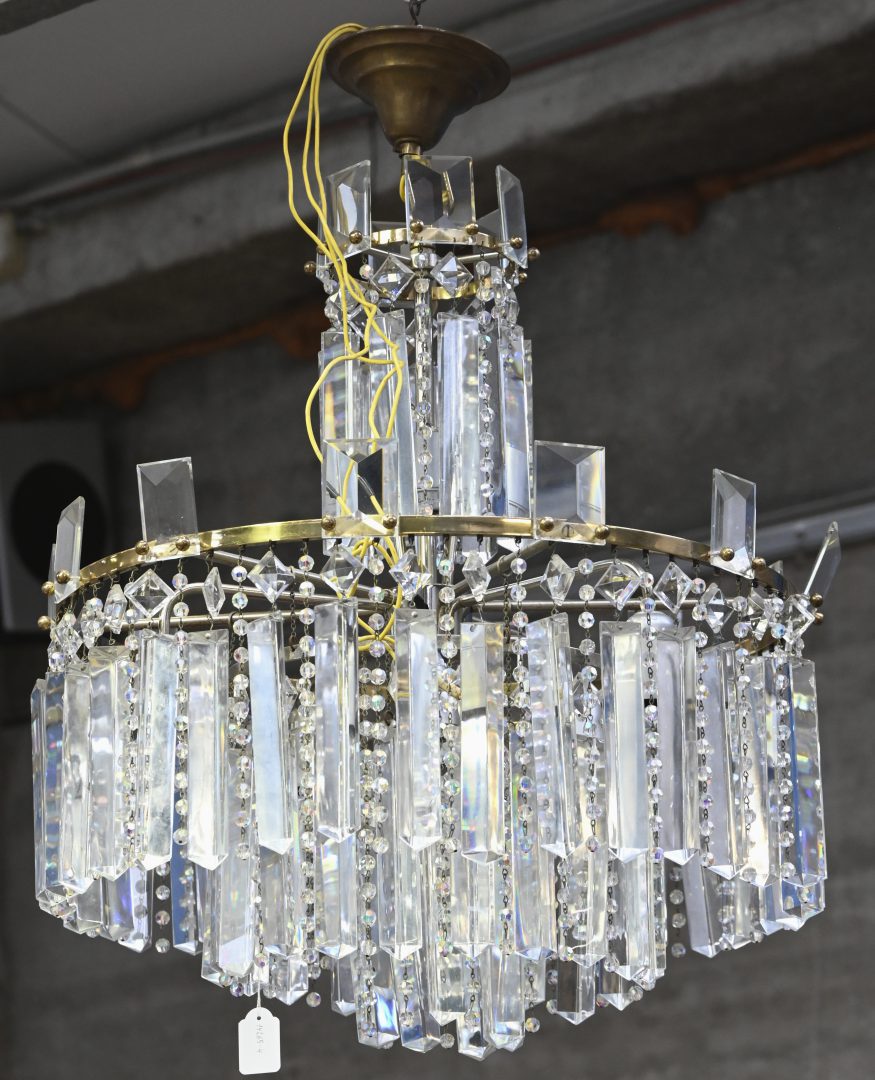 #493Een messingen luchter met kristallen pendeloques.