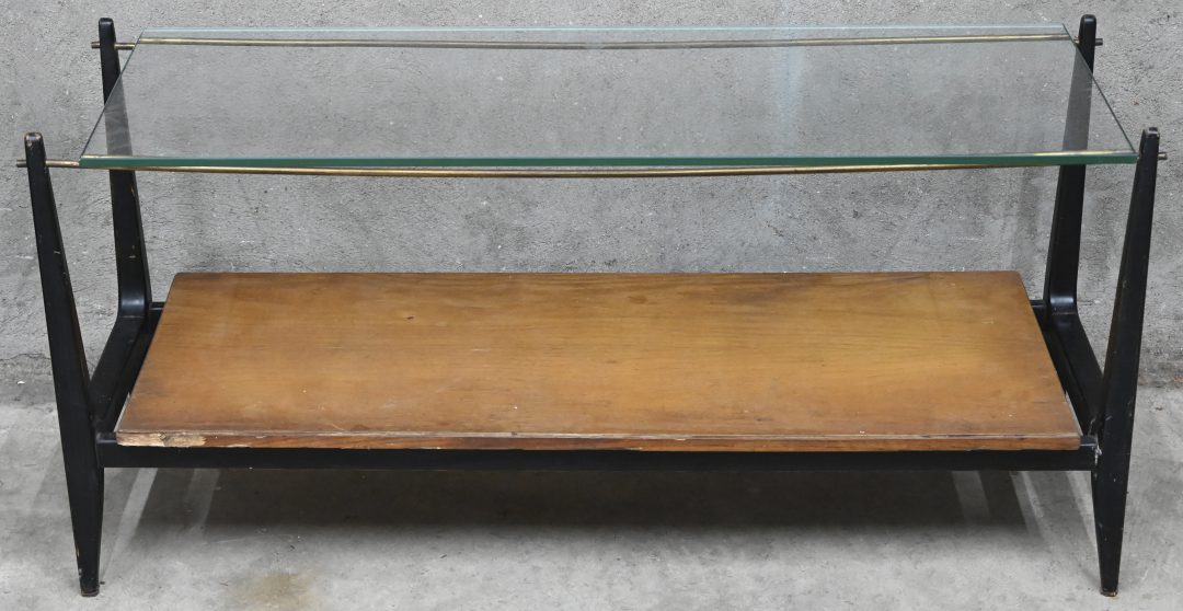 #596Een vintage salontafeltje van goudkleurig aluminium en glas. In de stijl van Pierre Vandel.