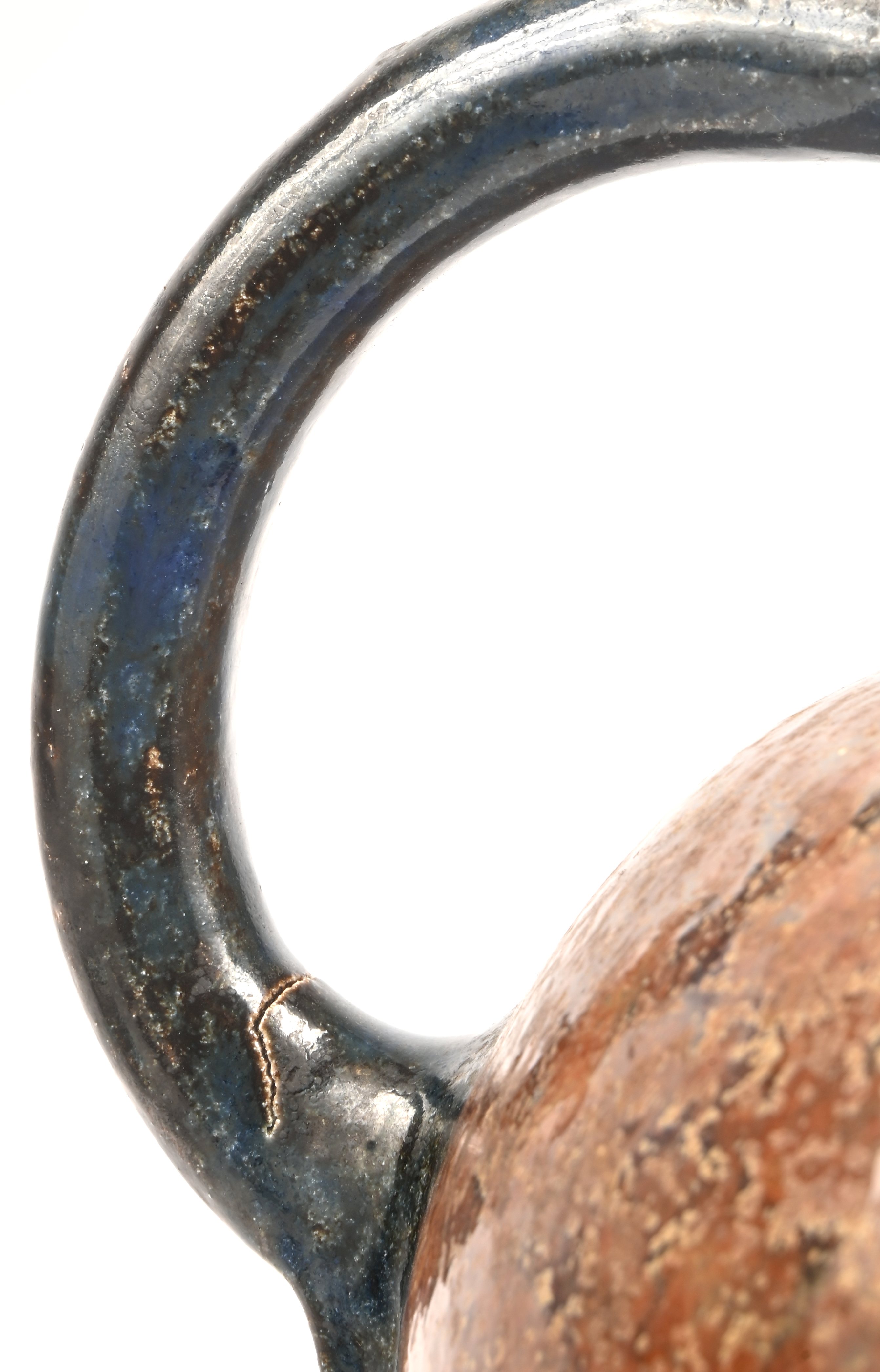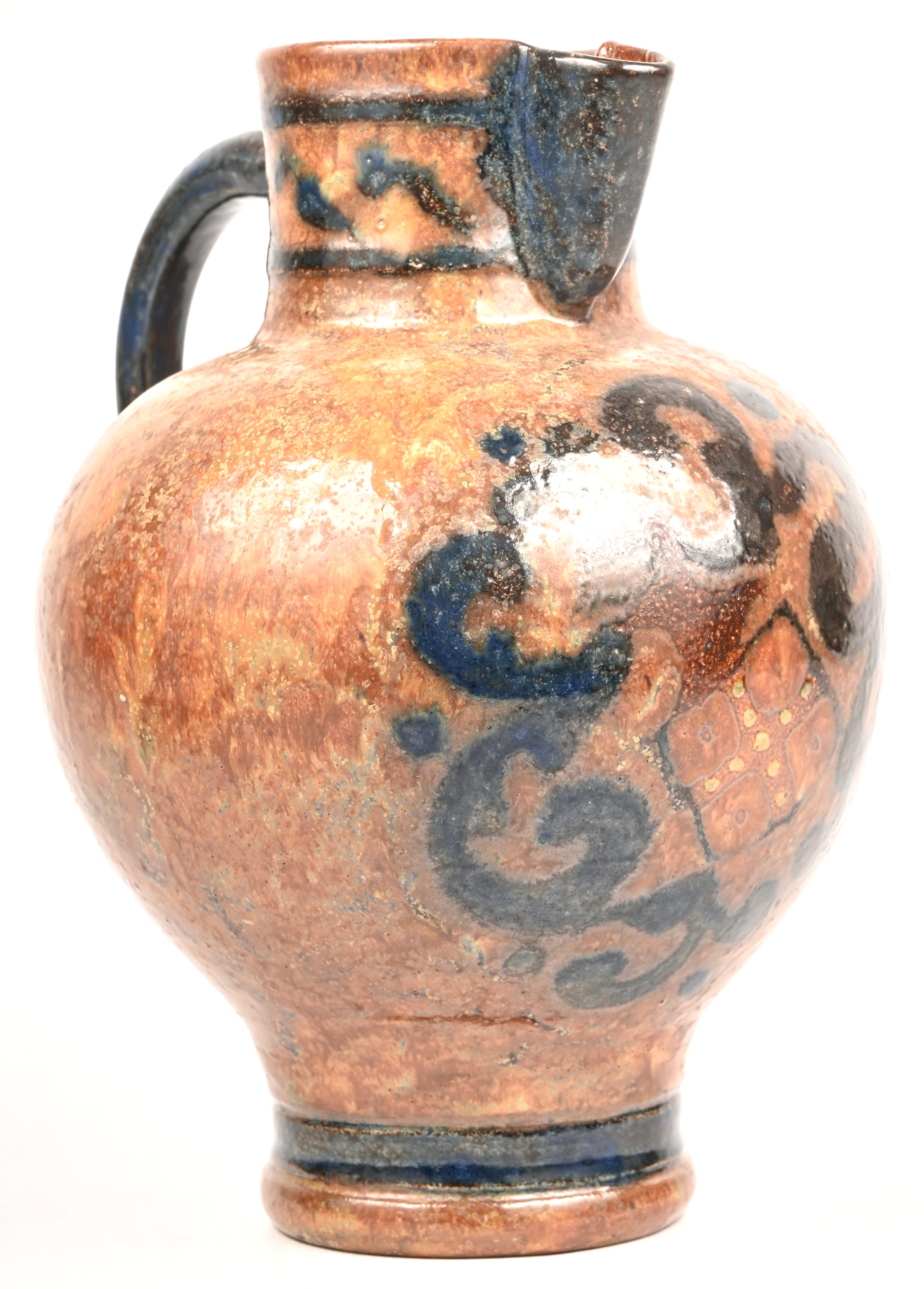 Een vintage schenkkan van geglazuurd aardewerk. Getekend C. Delsaux. Met enkele bakfouten.