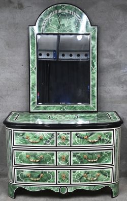 A commode with matching mirror in Regency style with malachite decoration, marked Colombo Mobili, in the style of Maison Jansen. -