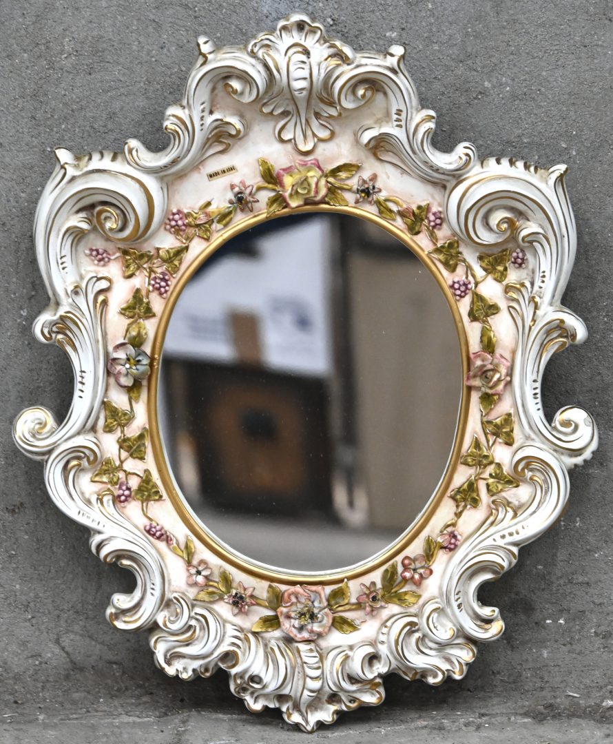 #24Een spiegel in vergulde kunststoffen kader, rijkelijk gedecoreerd.