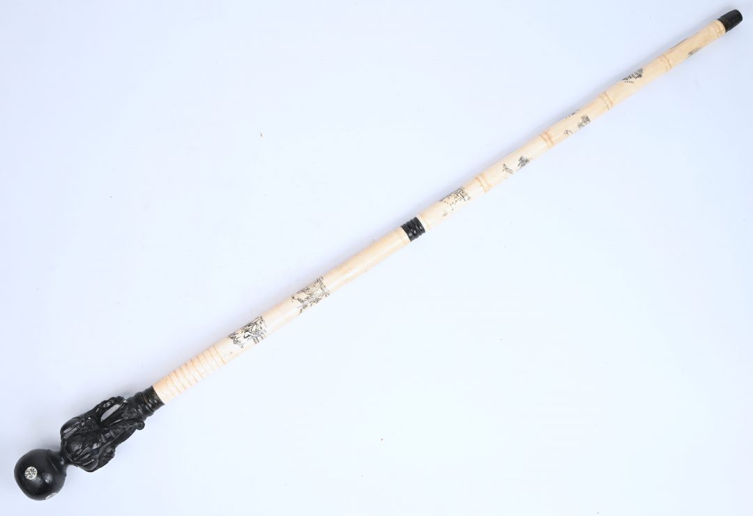 A walking stick in wood and bone with Oriental decorations. Cracked just above the middle.