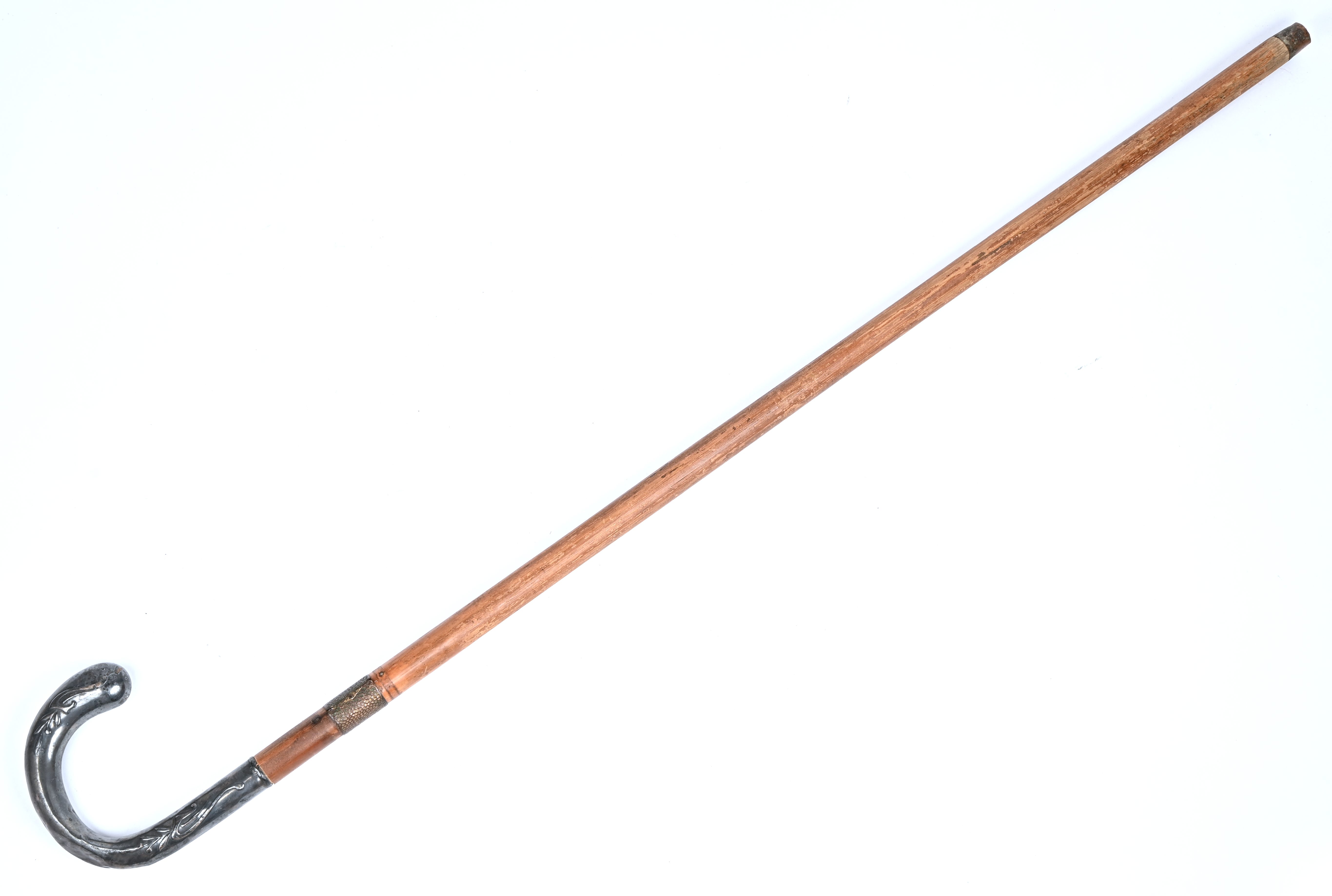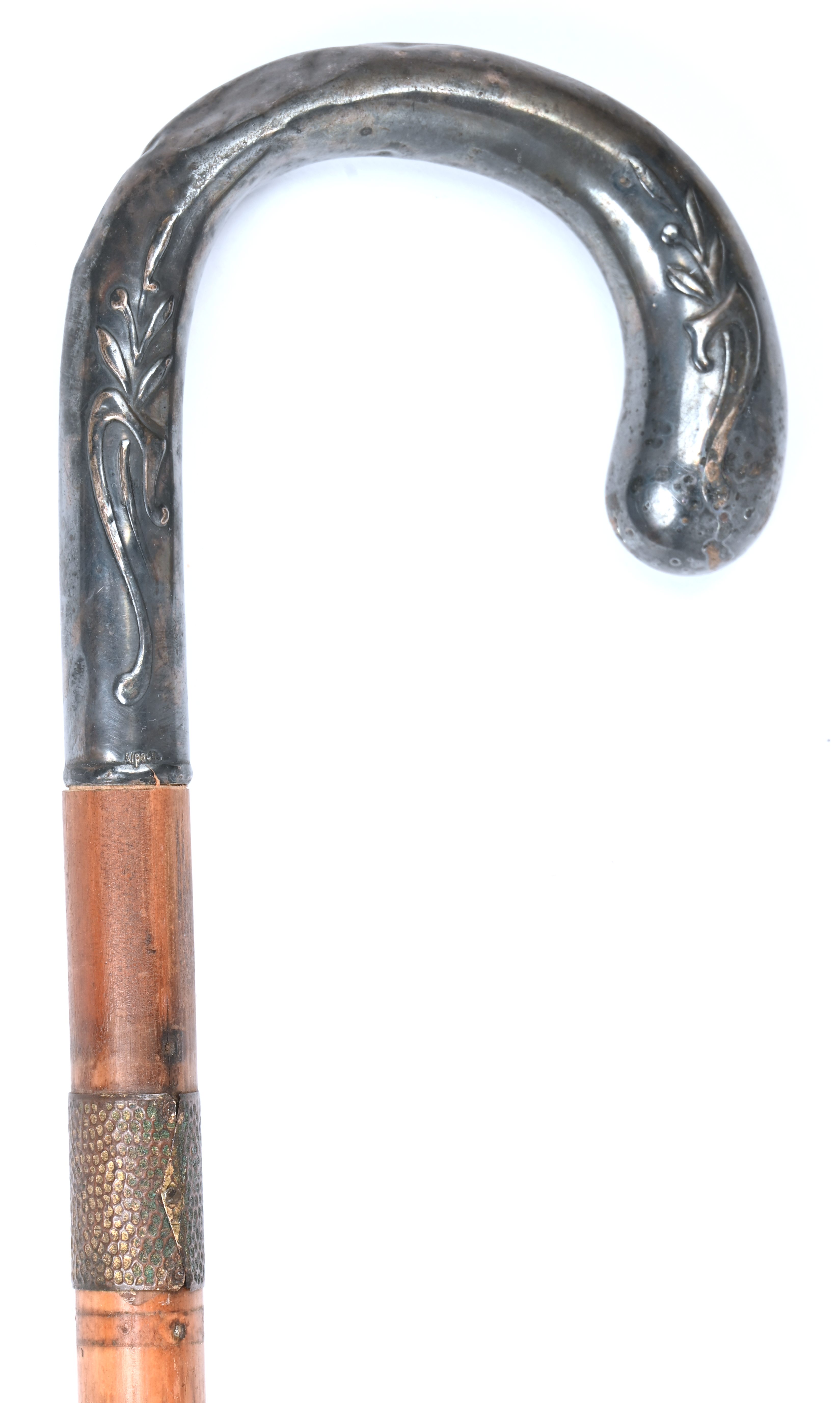 A walking stick with a curved handle featuring Art Nouveau decoration.