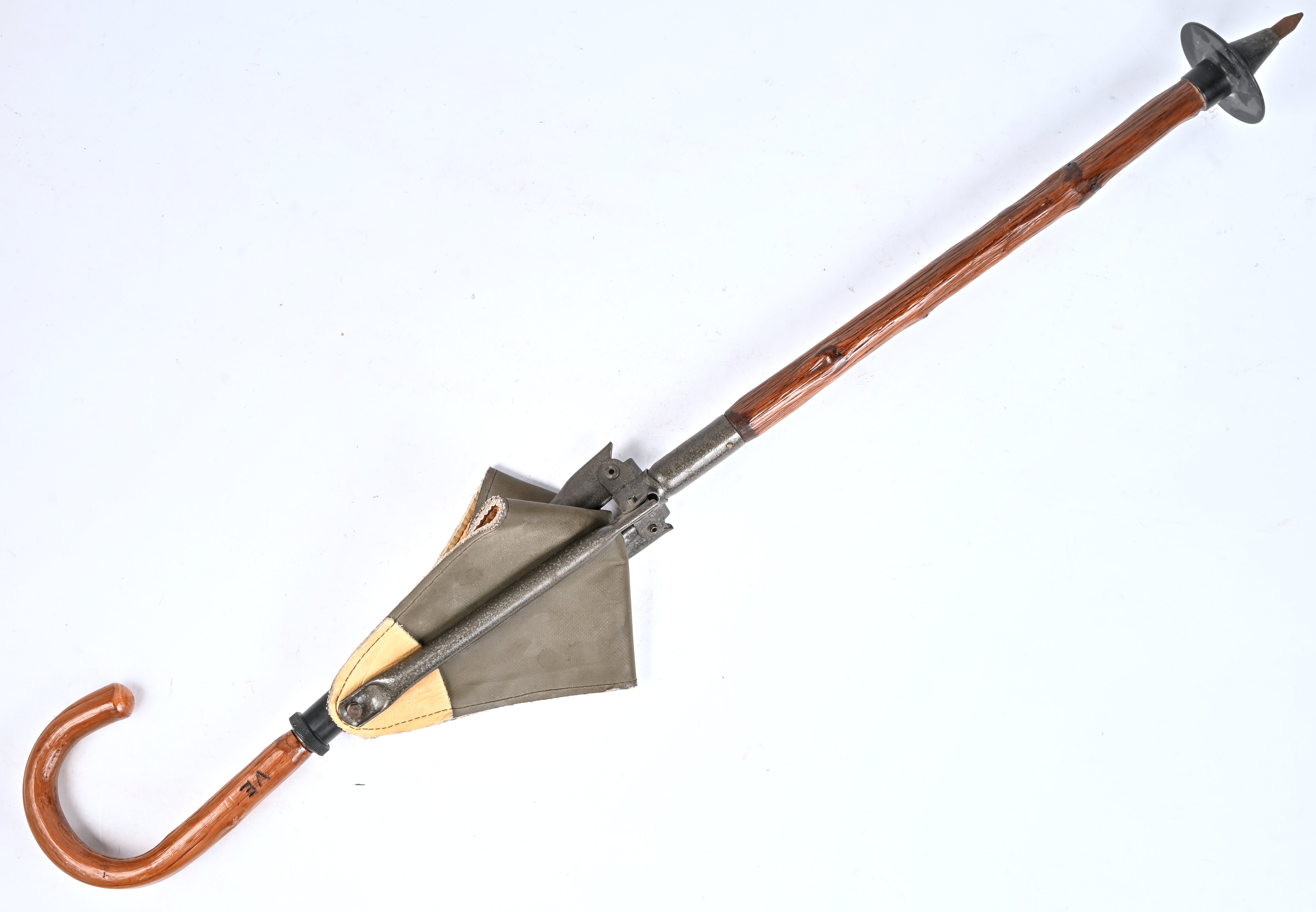 #51FeatherwateEen oude houten wandelstok, openklapbaar tot een krukje. Met enkele herstellingen aan het handvat.