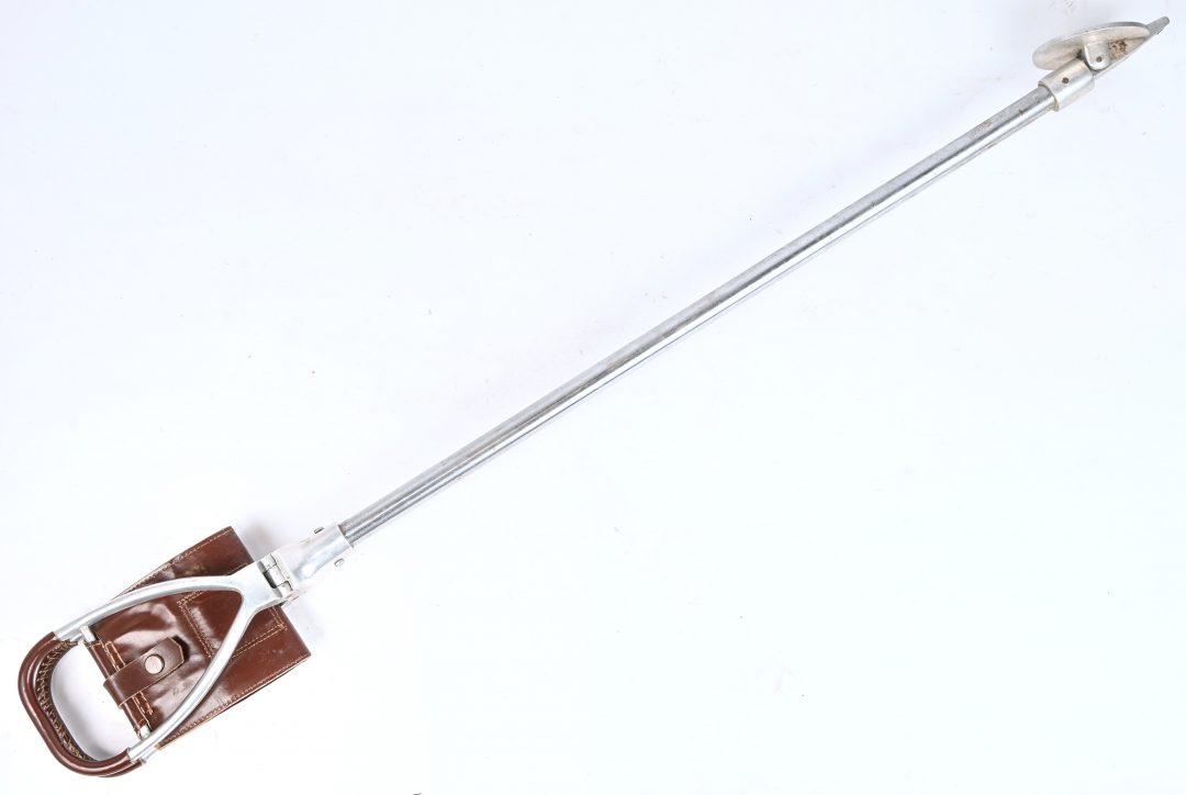 An aluminum and leather walking stick, foldable into a stool. -