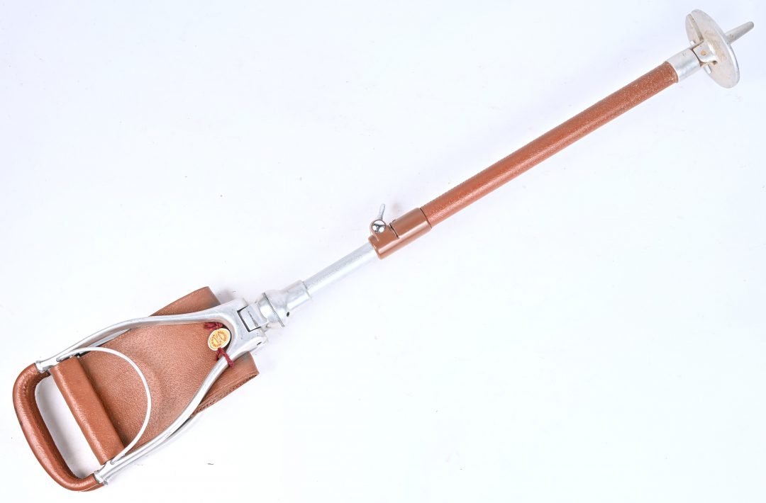 A walking stick of aluminum and leather, foldable into a stool. -