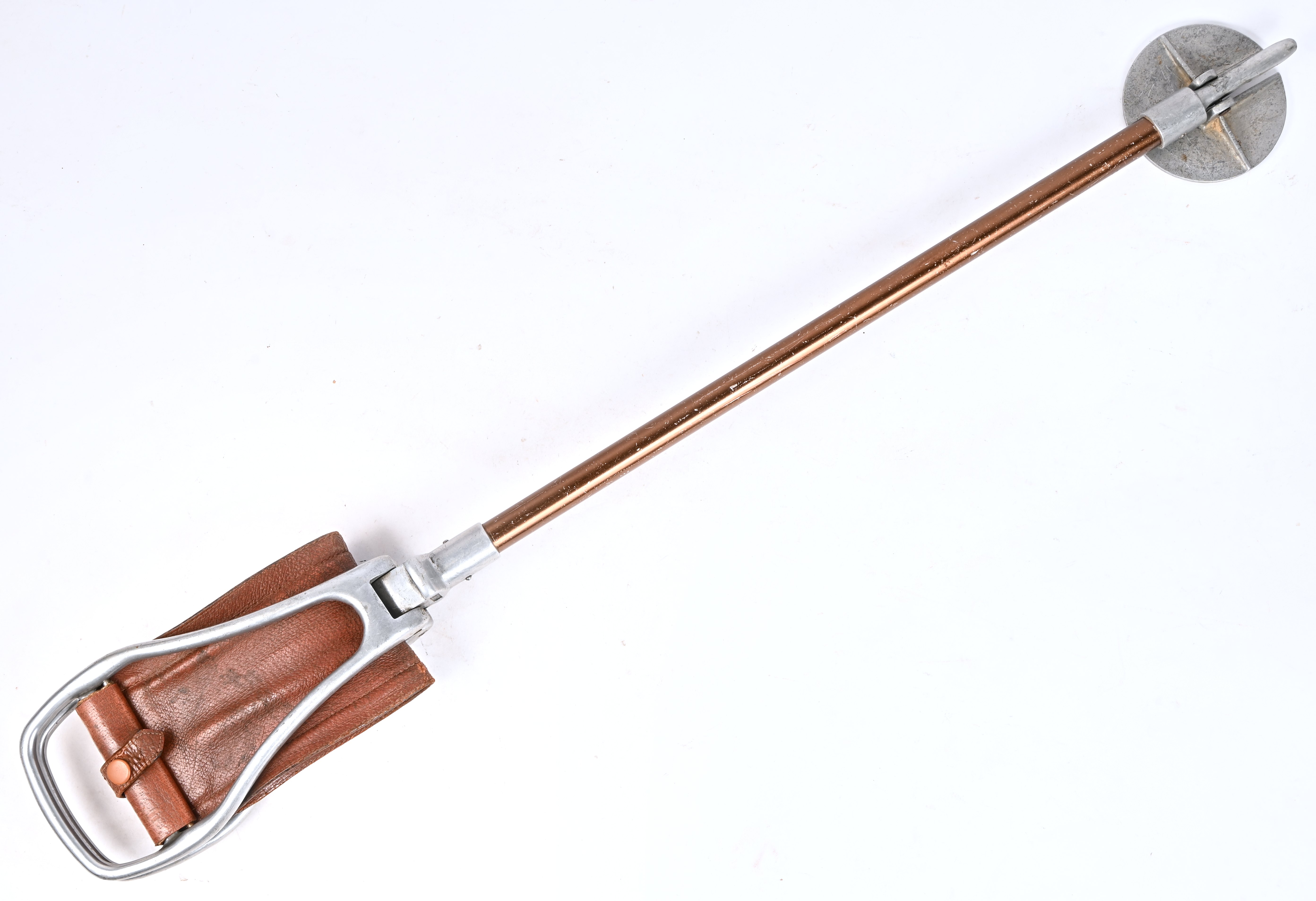 An aluminum and leather walking stick, foldable into a stool. -