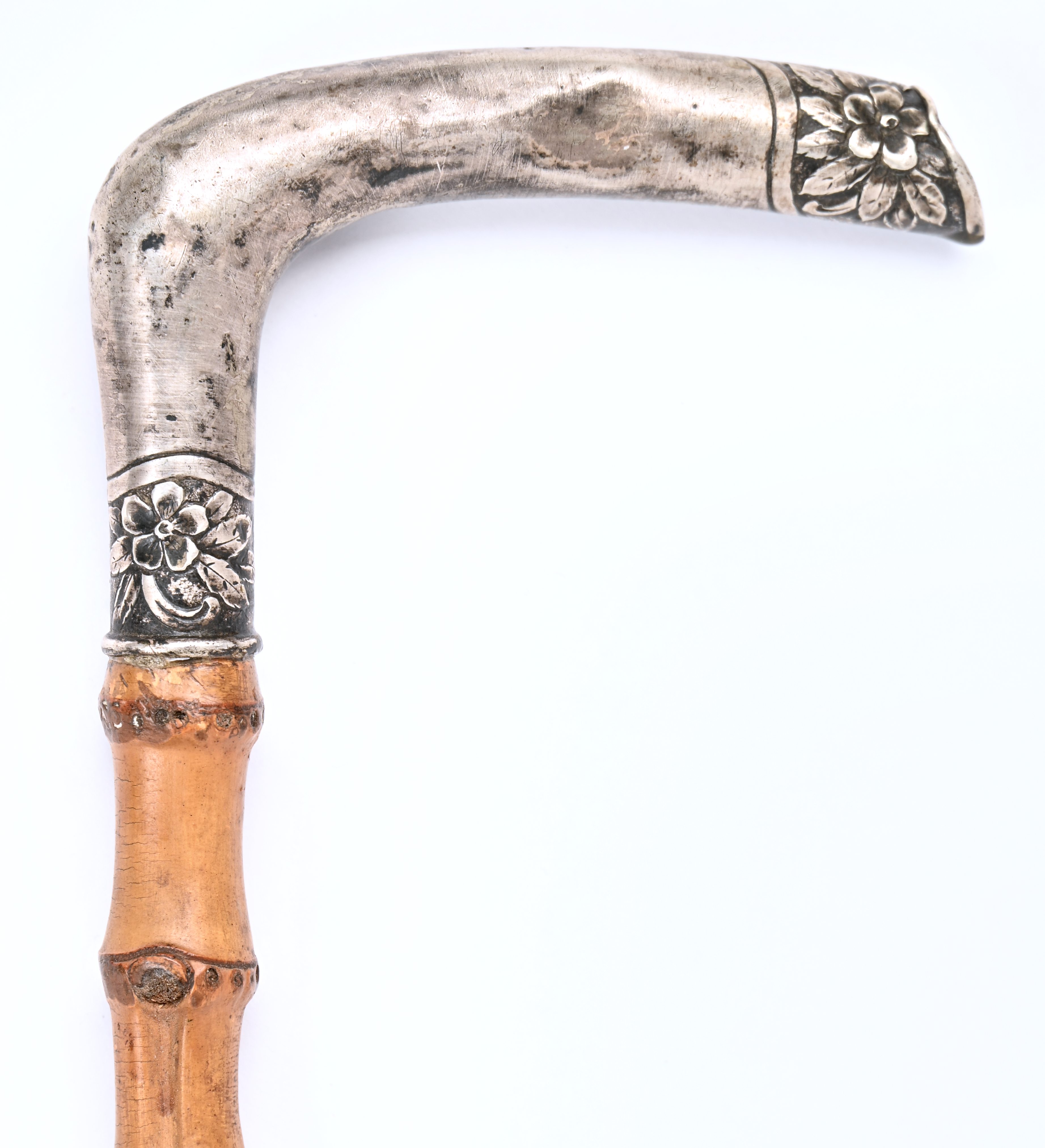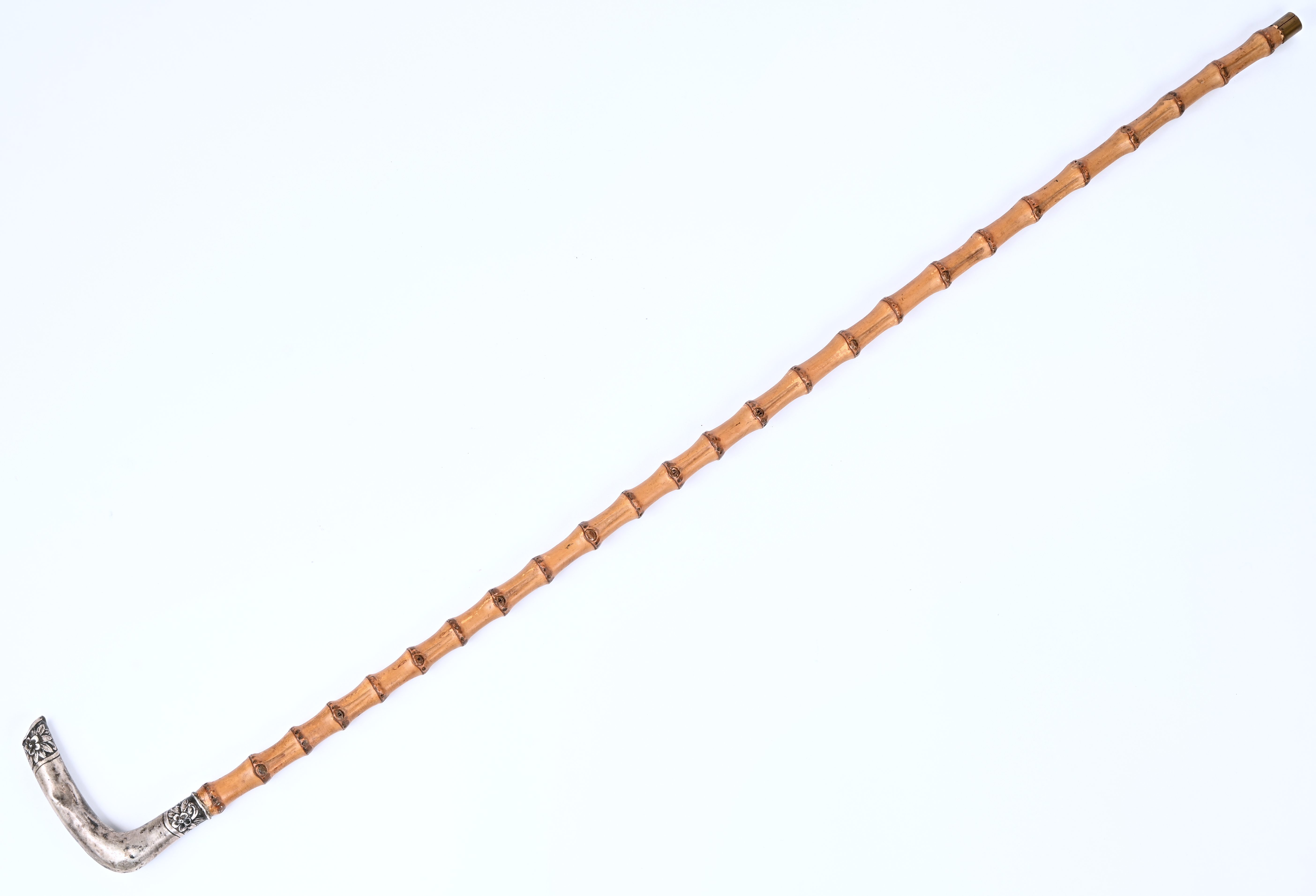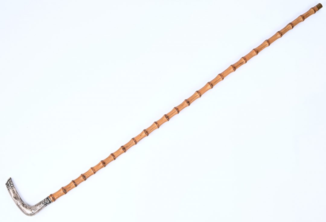A walking stick made of bamboo with a silver handle, marked 800.