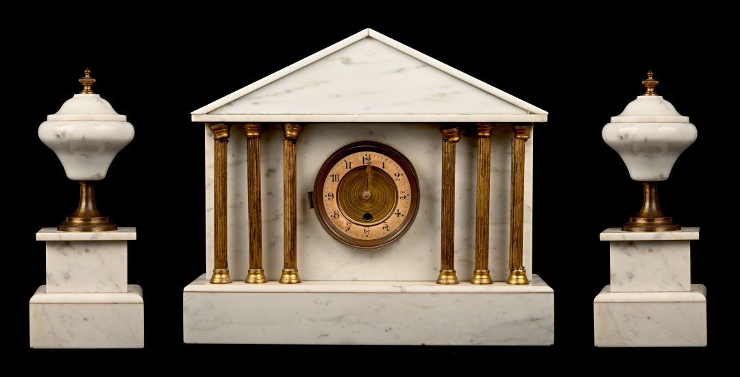 A clock set of black and green marble, with corresponding ornaments. The clock is in need of restoration. -