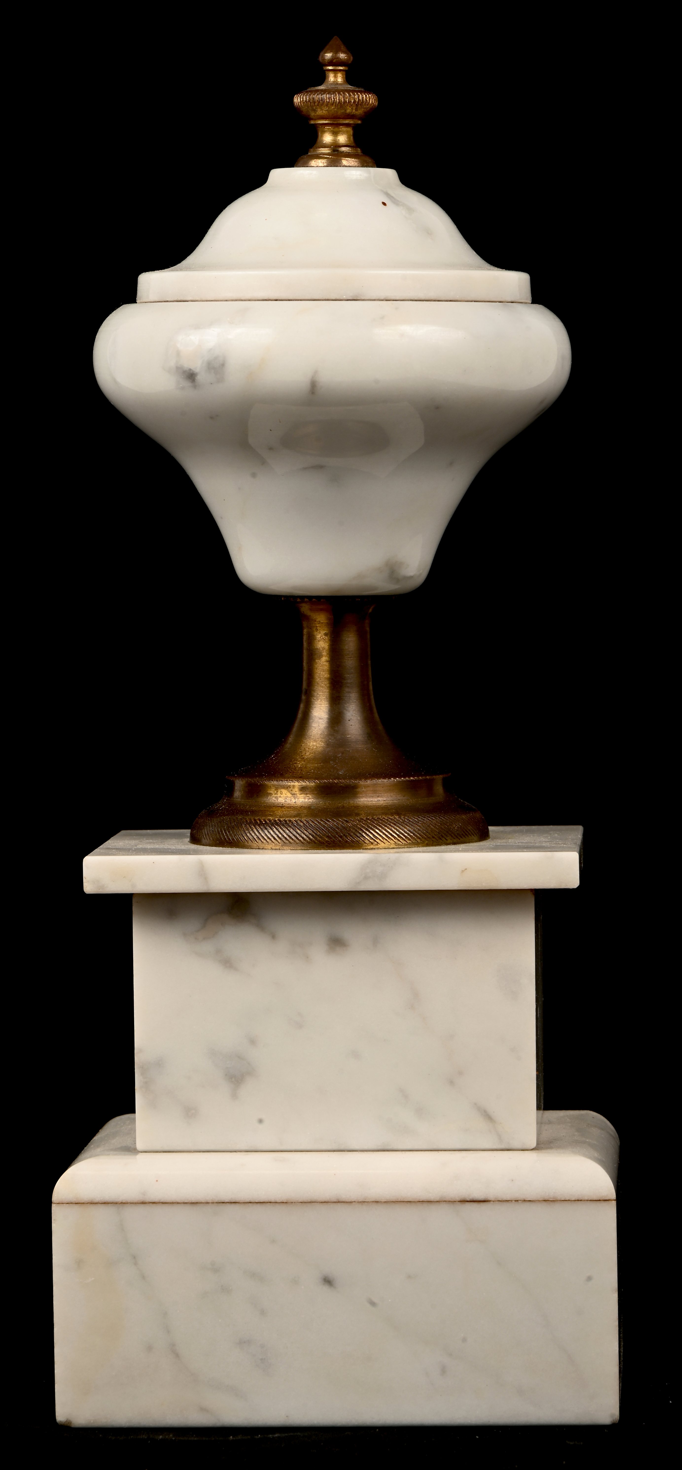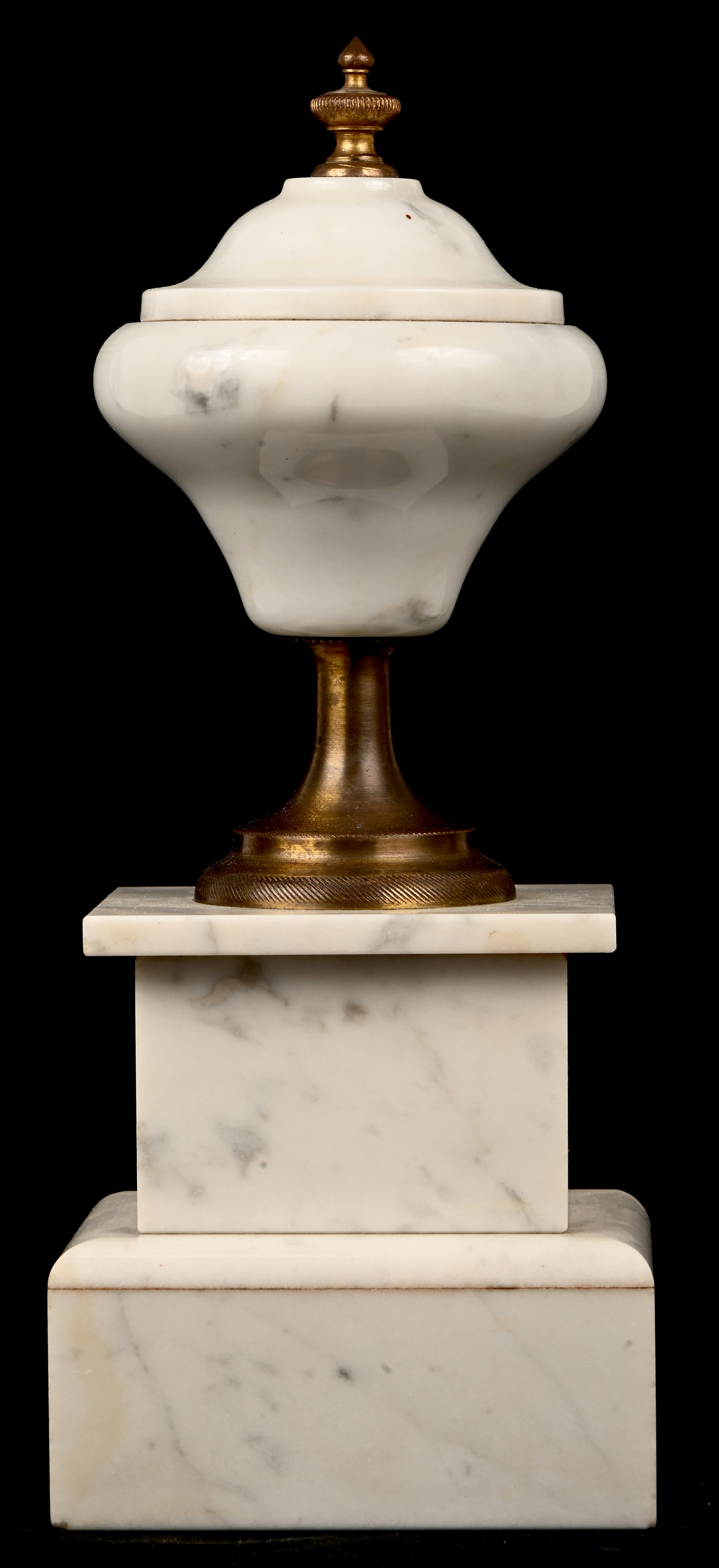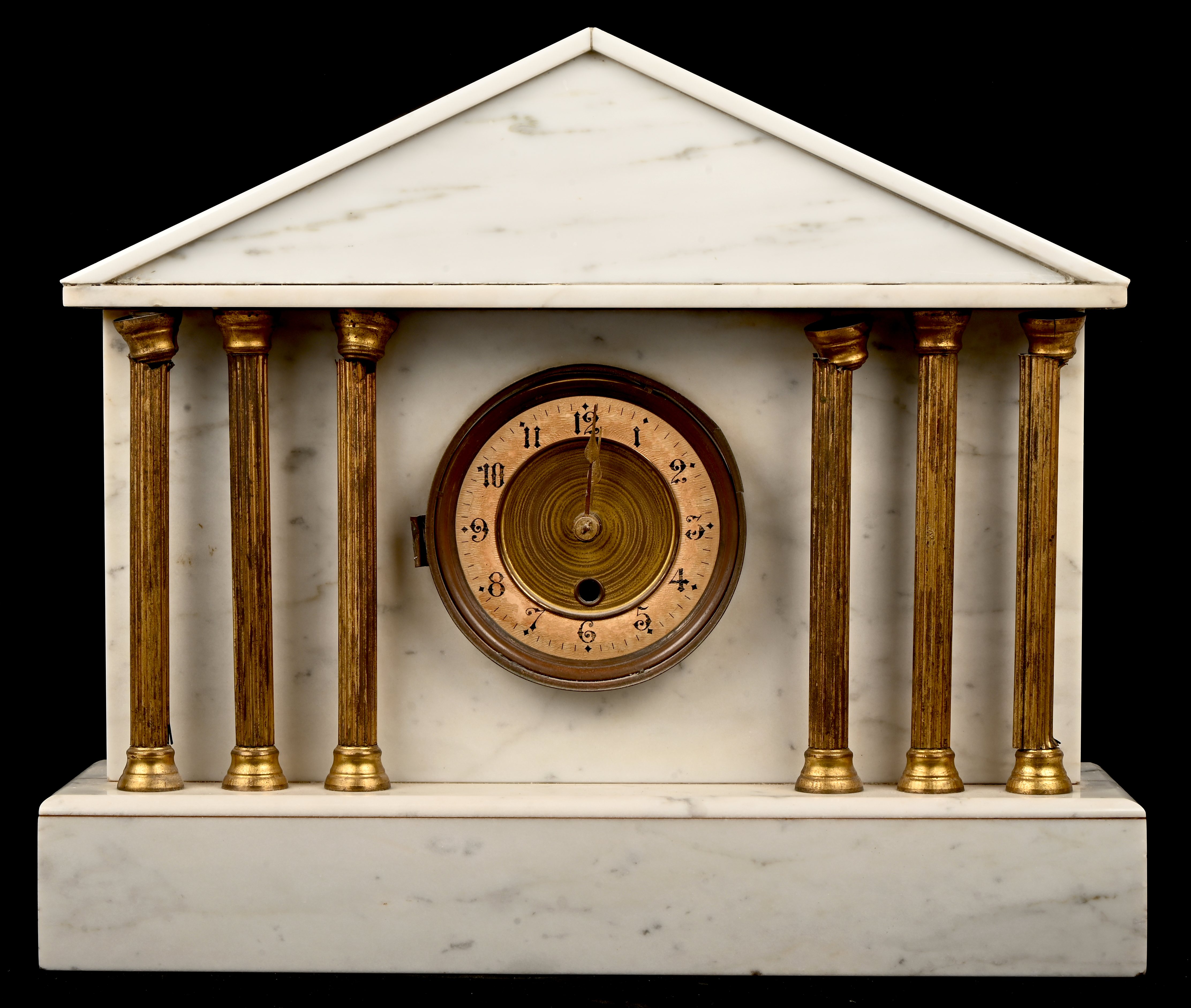 #248Een klokstel van zwart en groen marmer, met bijbehorende ornamenten. Het uurwerk is te herstellen.