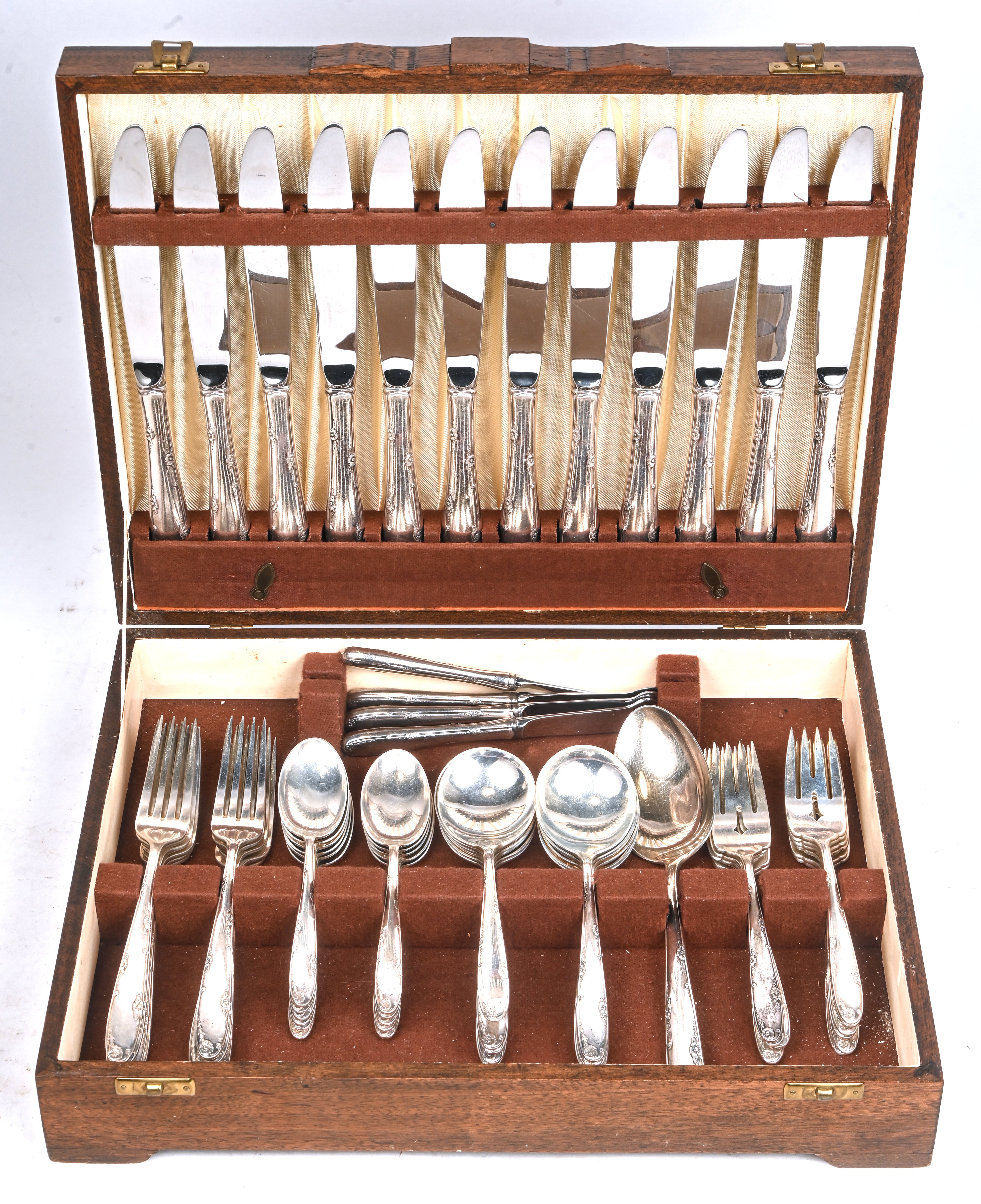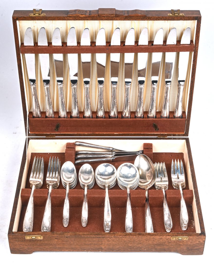 Een zilveren bestek, gemerkt Towle Sterling Madeira, bestaande uit 11 grote vorken, 11 vorken, 12 lepels, 11 koffielepels, een serveerlepel, 12 messen en 4 botermesjes. 1770 gram. In bijhorende bestekcassette.