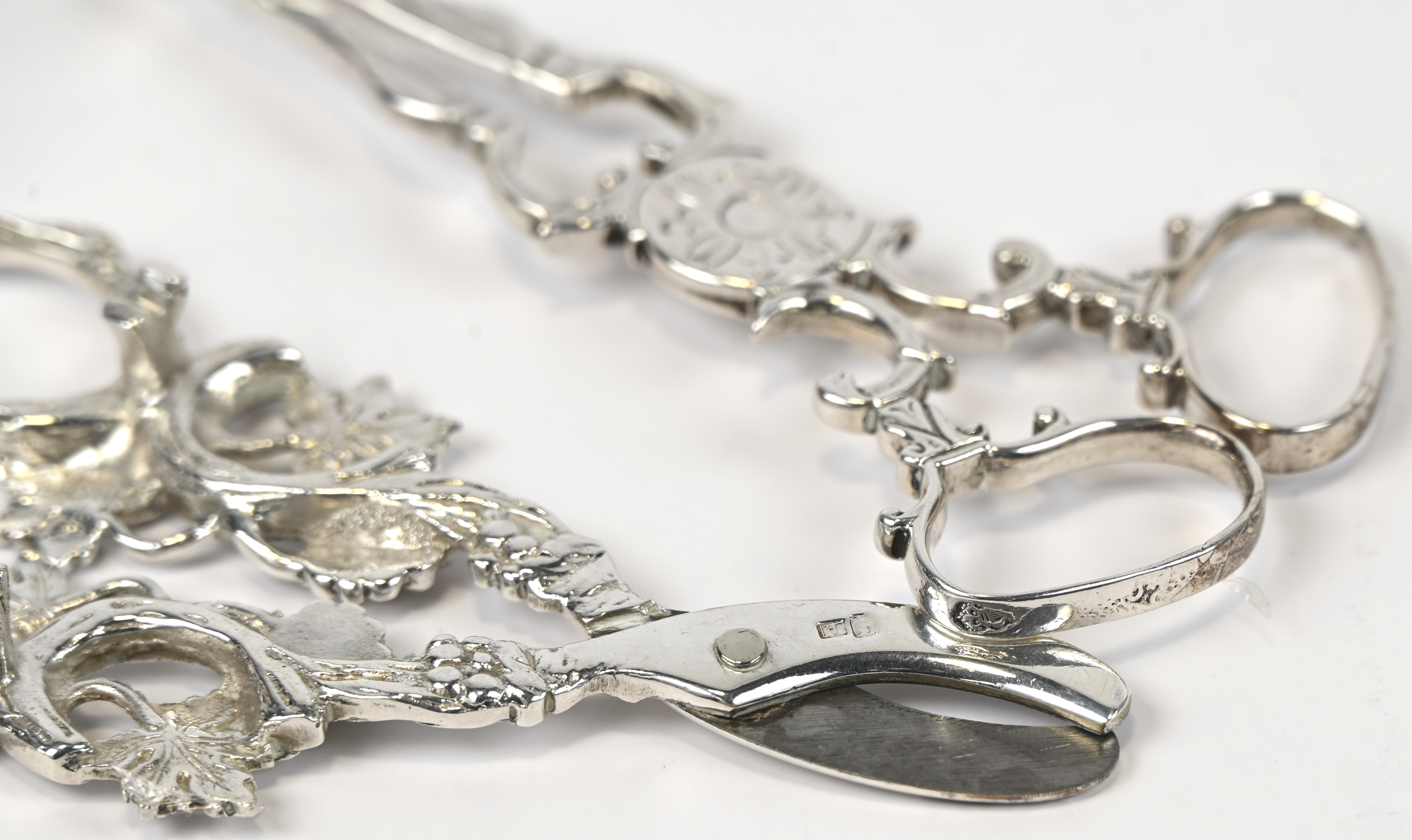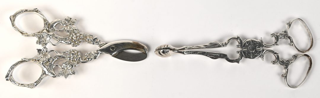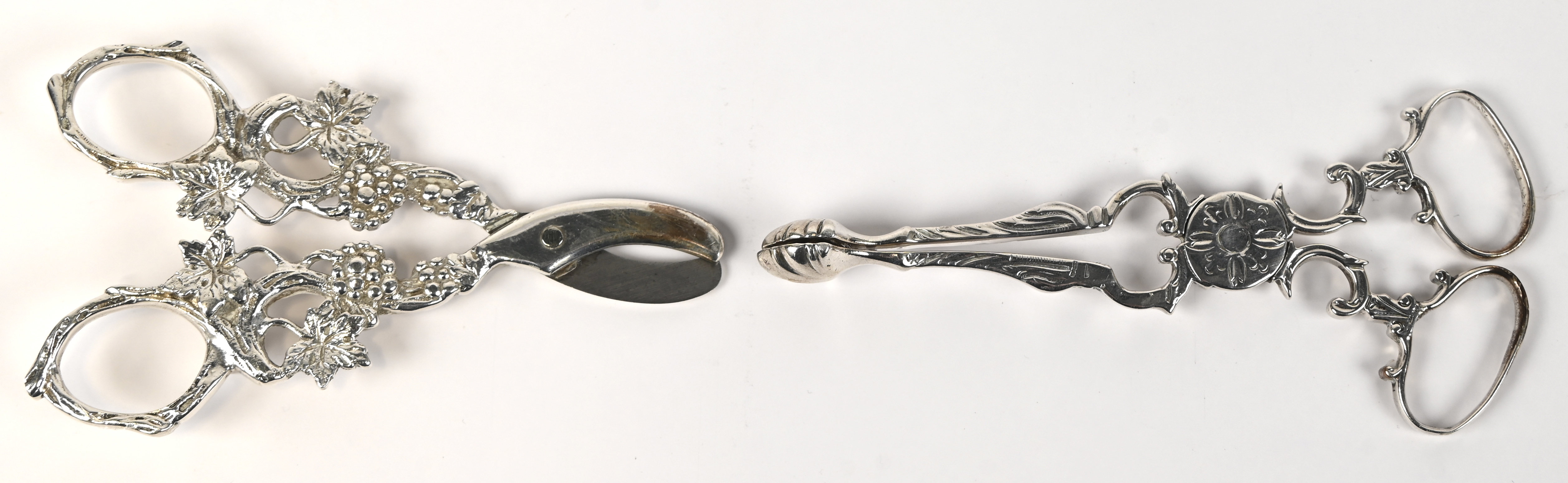 Een zilveren druivenschaartje en een suikertang, onleesbaar gekeurd. 95 g AR-1-2