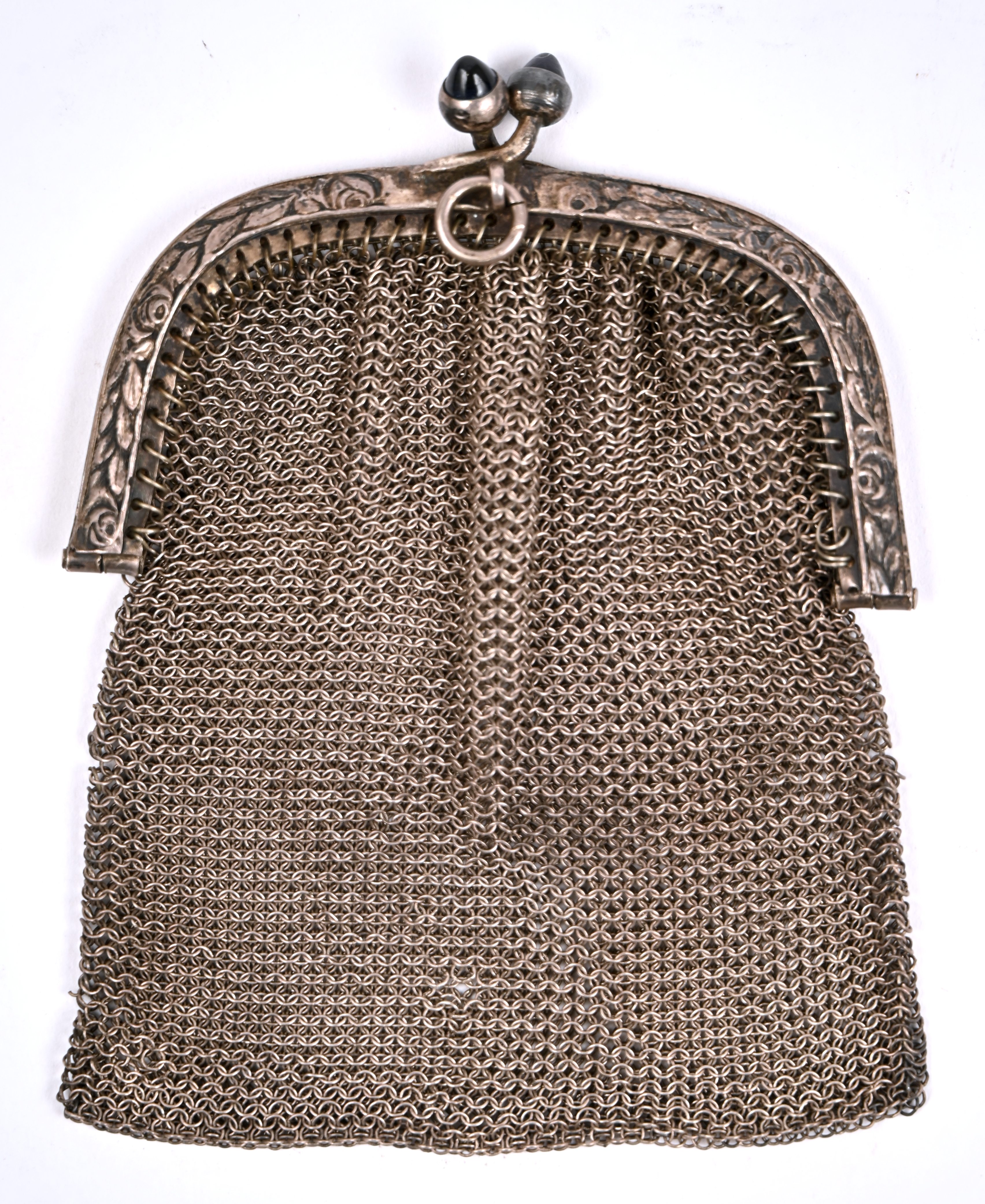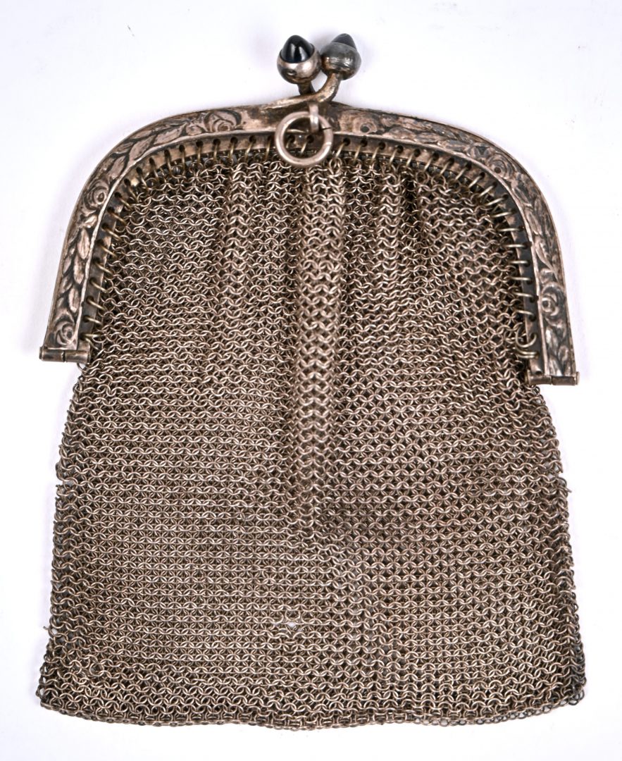 Een zilveren geldbeugeltje, gemerkt 830, met 2 saffiertjes op de sluiting.