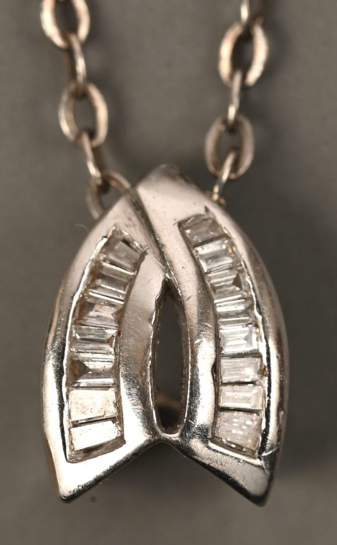 Een zilveren ketting met 18 kt witgouden hanger bezet met diamant baguettes met een gezamenlijk gewicht van +- 0,40 ct.